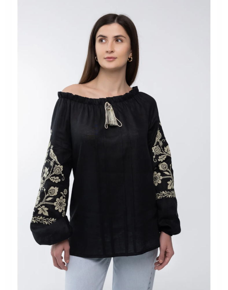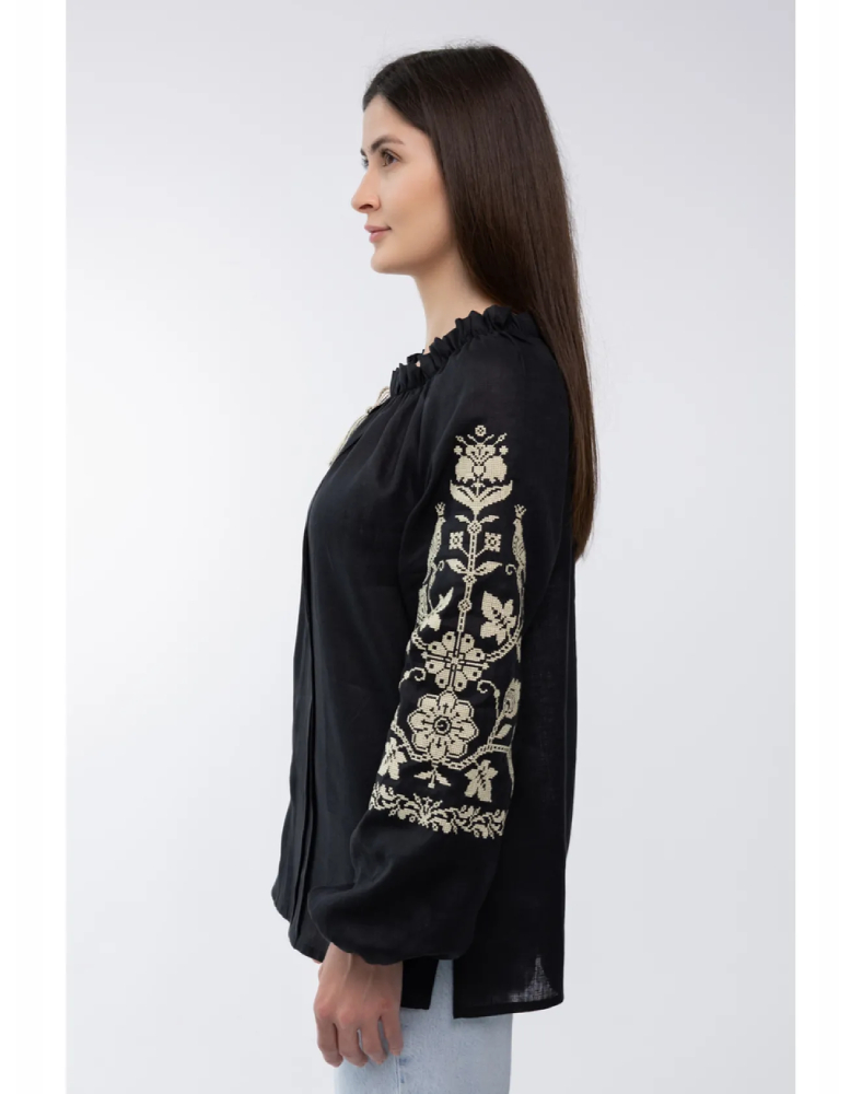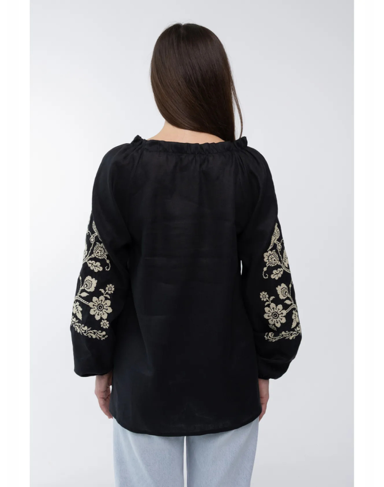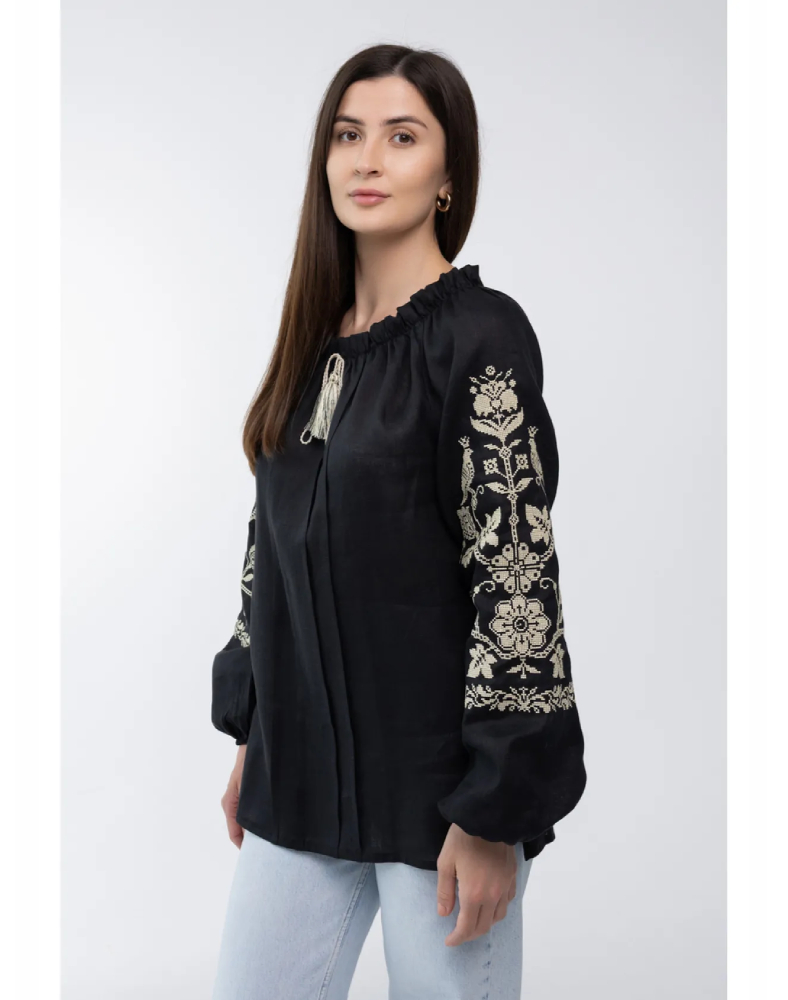 Блуза «Божена» — це вишукана жіноча модель у глибокому чорному кольорі, яка поєднує натуральний льон, стриманий силует і виразну світлу вишивку. Такий контраст виглядає благородно, стильно й дуже ефектно, тому модель легко привертає увагу та підкреслює витончений смак своєї власниці. Чорне полотно додає образу глибини, а світлий орнамент на рукавах робить його більш м’яким і жіночним.