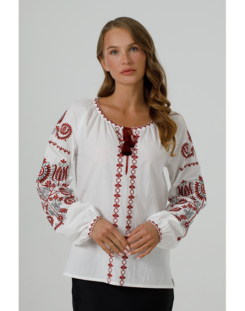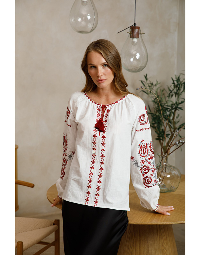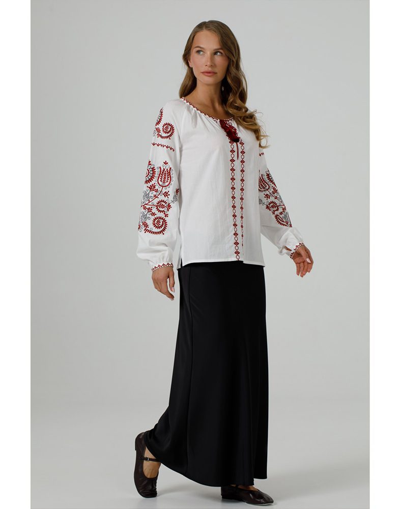 Головний акцент моделі — виразна вишивка в традиційному орнаменті “Цвітана”, виконана насиченими червоними нитками. Вона виглядає яскраво, контрастно та особливо святково. Силует вільний і універсальний, підходить для різних типів фігури та створює ефект акуратного, витонченого образу.