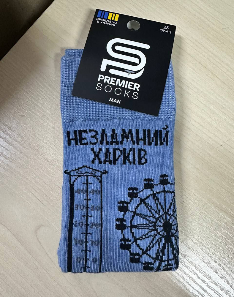 Стильні чоловічі шкарпетки з символічним принтом — поєднання комфорту та характеру. Лаконічний блакитний колір доповнений тематичним малюнком і написом “Незламний Харків”, що додає виробу особливого змісту та емоційного акценту.