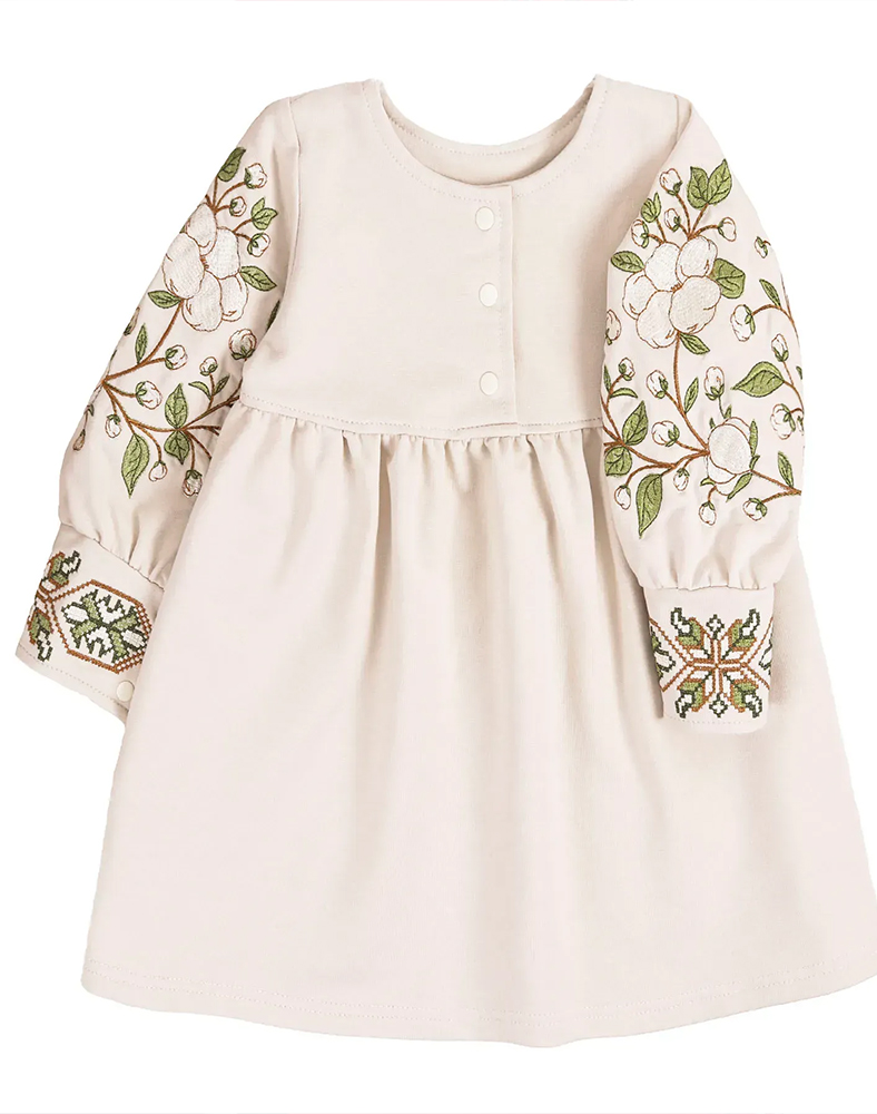 Дитяча вишита сукня для дівчинки з натуральної бавовни — це поєднання ніжності, комфорту та українських традицій у сучасному виконанні. Світлий відтінок крем-брюле робить образ м’яким і теплим, а витончена вишивка бавовни на рукавах додає сукні особливого настрою й святкової елегантності без надмірної урочистості.