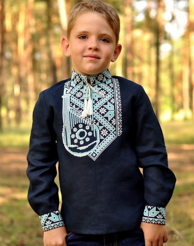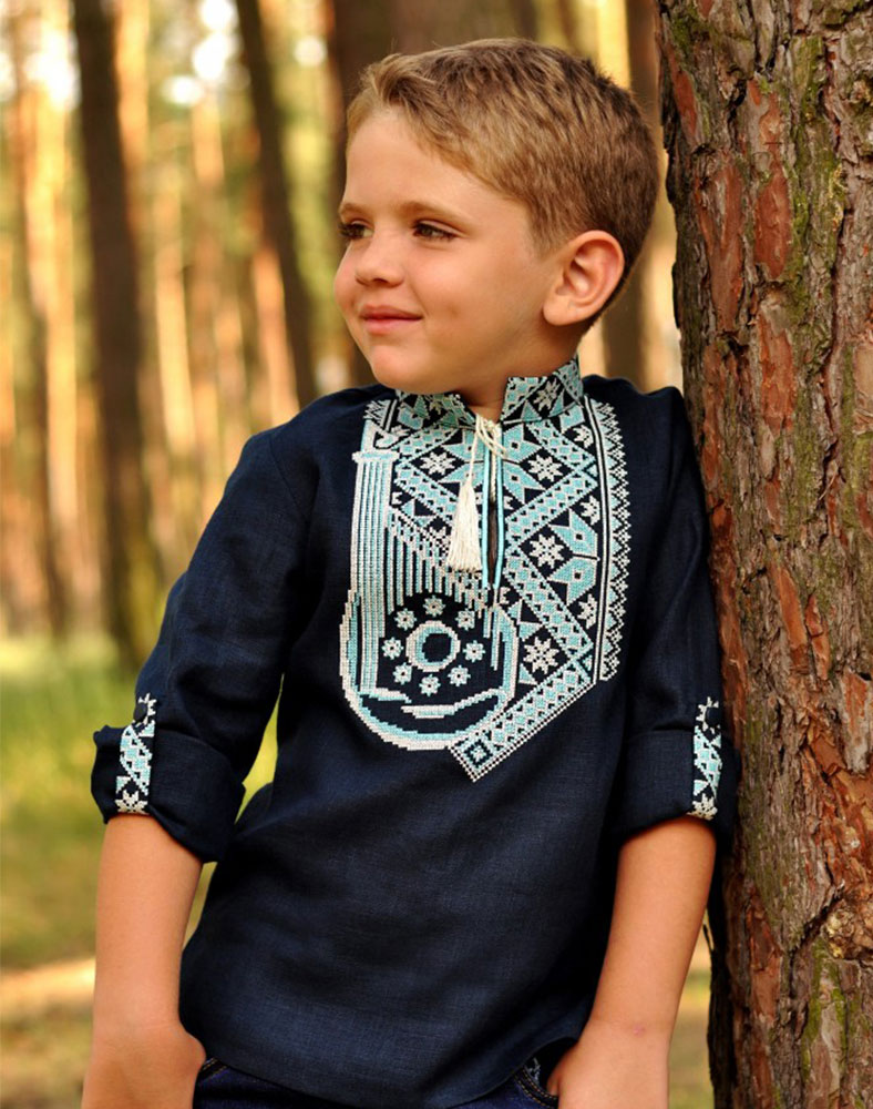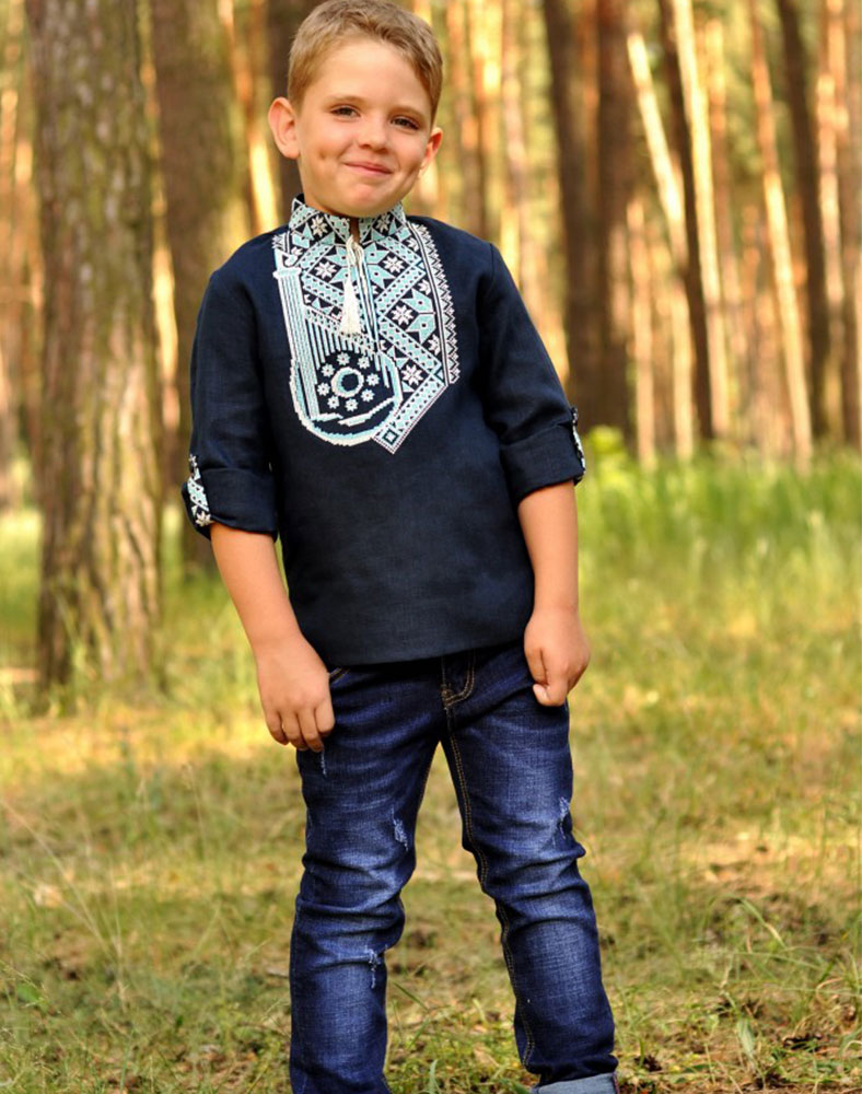 Ця стильна вишиванка для хлопчика виконана з 100% натурального льону темно-синього кольору. Тканина приємна на дотик, добре пропускає повітря та забезпечує комфорт навіть у спекотні дні.