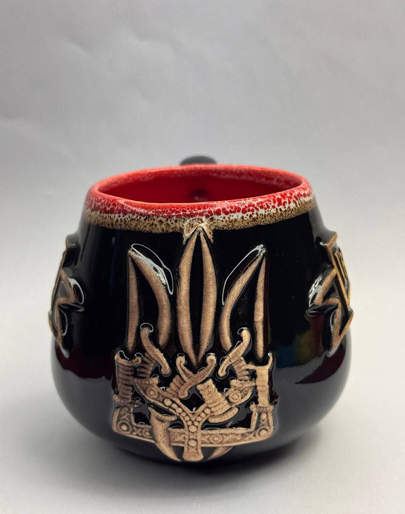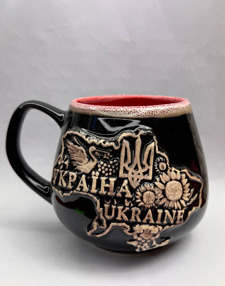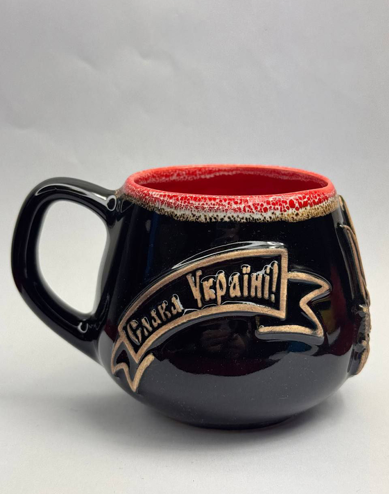 Керамічна глиняна чашка “Україна” 0,4 л — чорна з червоним, глянсова, з Тризубом
