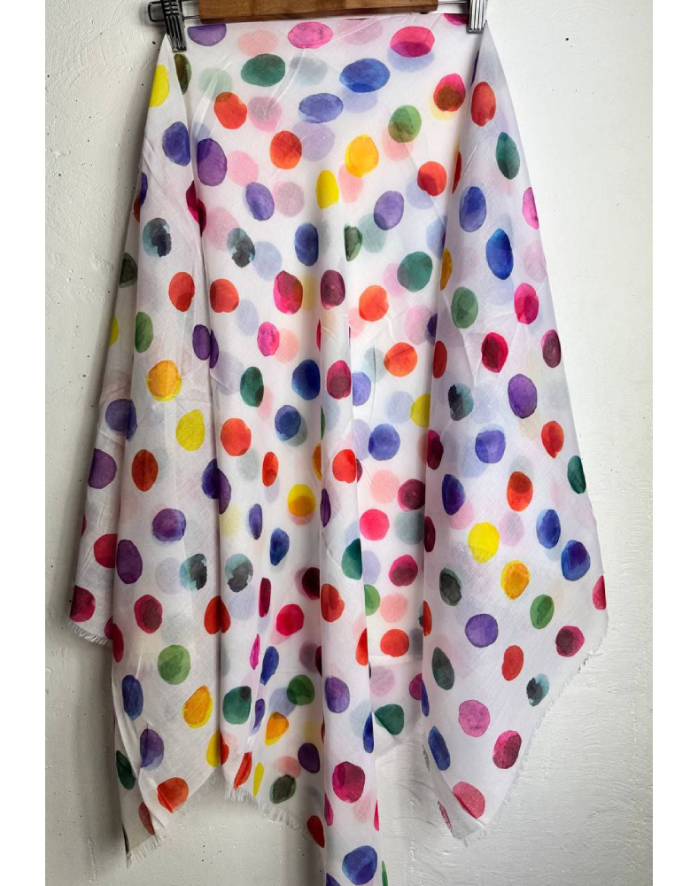 Легка батистова хустка-павутинка з білим фоном та яскравим різнокольоровим орнаментом у горошок — це стильний і життєрадісний аксесуар, який поєднує легкість, свіжість і сучасну декоративність. На світлому тлі розташовані кольорові круглі елементи у рожевих, синіх, фіолетових, жовтих, зелених і червоних відтінках, що створюють веселий, динамічний і дуже привабливий образ.