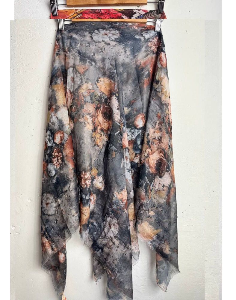 Легка батистова хустка-павутинка з благородним сірим фоном та вишуканим квітковим орнаментом — це елегантний аксесуар, який поєднує стриману красу, художню м’якість і комфорт у носінні. На димчасто-сірому тлі розгортається ніжний квітковий візерунок у теплих бежевих, кремових, пудрових і кавово-персикових відтінках, що створює глибокий, гармонійний і дуже стильний образ.