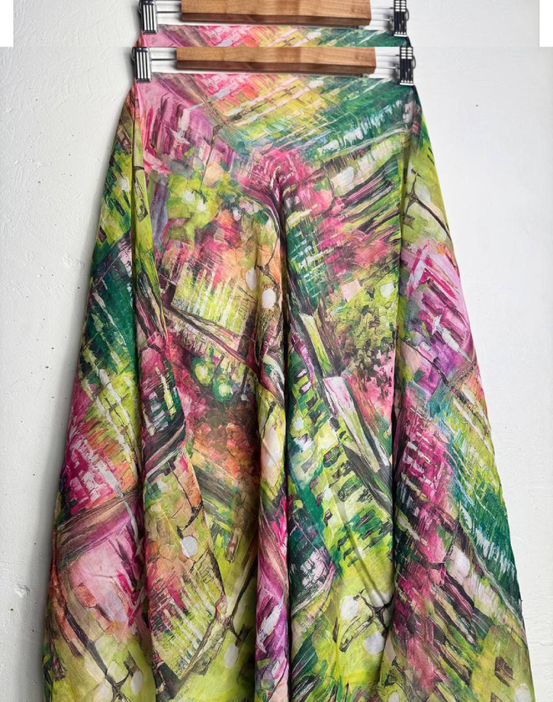 Легка батистова хустка-павутинка з виразним абстрактним орнаментом — це стильний і повітряний аксесуар, який поєднує яскравість кольорів, художню естетику та комфорт у носінні. На світлому тлі гармонійно переплітаються насичені рожеві, зелені, жовті та м’які природні відтінки, що створюють живий, динамічний і дуже ефектний візерунок.