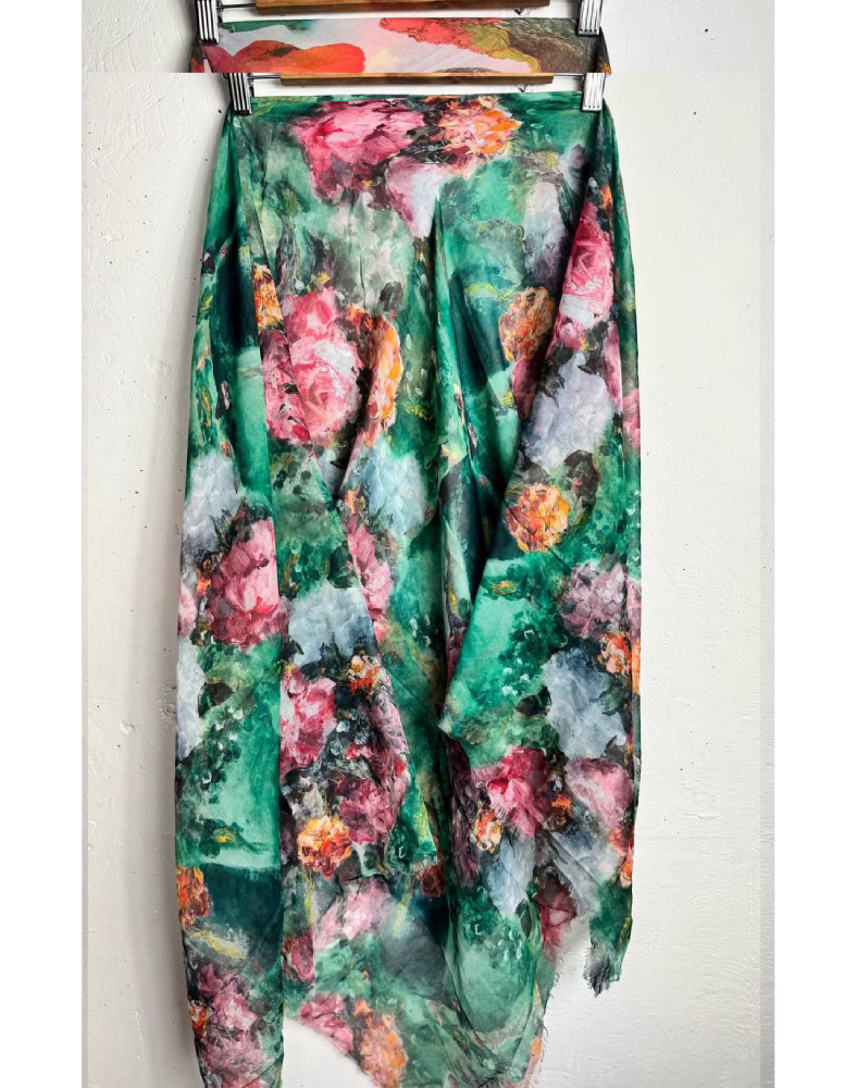 Легка батистова хустка-павутинка з насиченим зеленим фоном та ніжним акварельним квітковим орнаментом — це вишуканий аксесуар, який поєднує природну свіжість, романтичну жіночність і комфорт у носінні. На глибокому зеленому тлі розквітають великі квіти у рожевих, білих, сірих та теплих персиково-золотистих відтінках, що створюють живий, м’який і дуже елегантний образ.