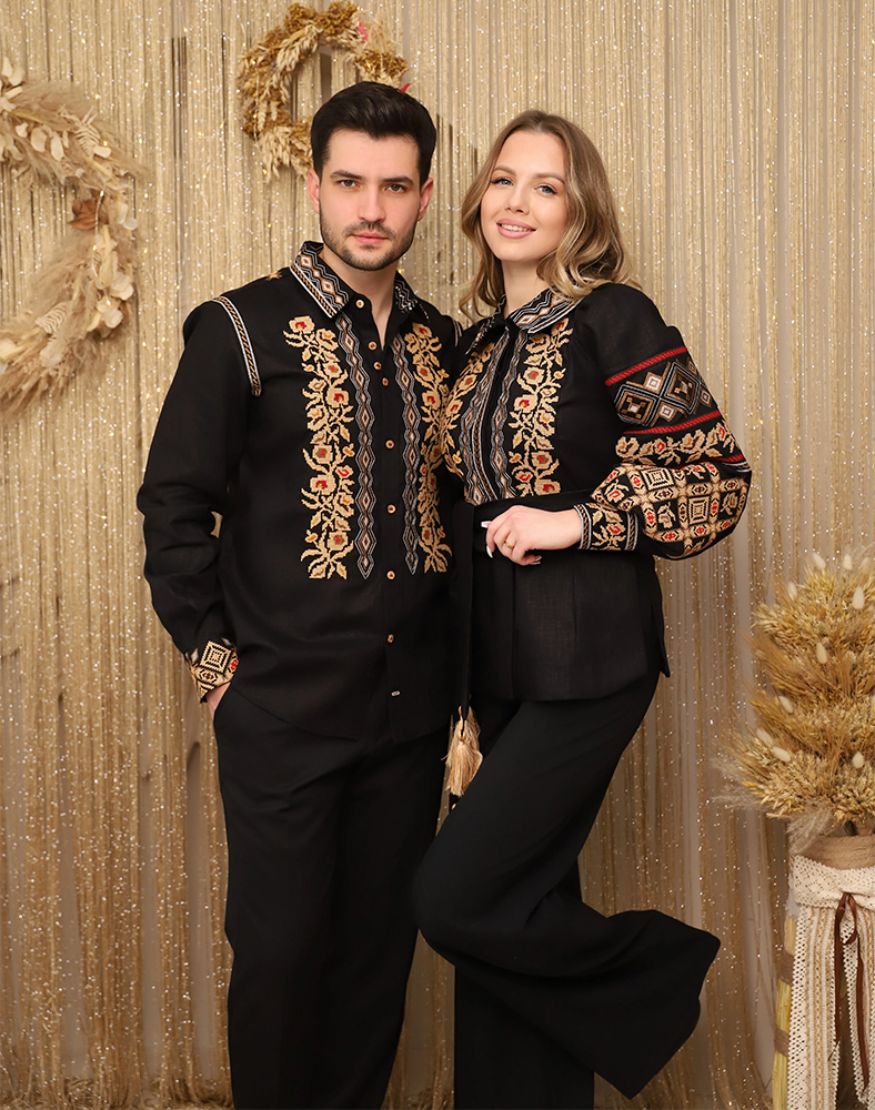 Обидві вишиванки виконані в техніці хрестик і об’єднані спільними орнаментальними мотивами. Візерунки символізують гармонію, добробут і єдність — саме ті сенси, які закладають у парні вишиванки для пари.