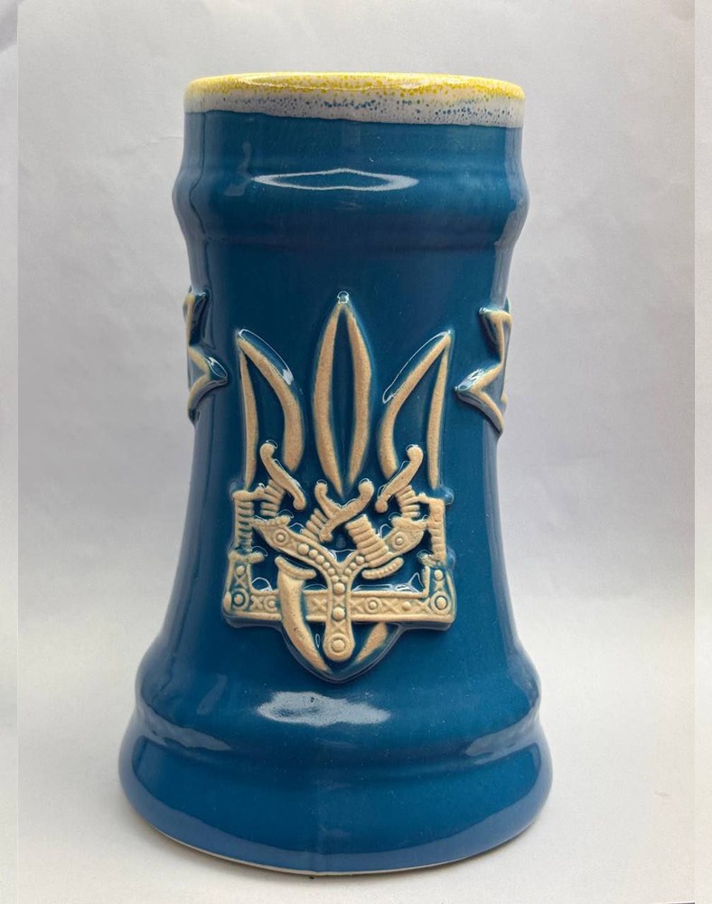 Пивний керамічний келих 0,3 л з Тризубом у матовому блакитному кольорі — це поєднання функціональності, естетики та української символіки. Рельєфний герб України та глибокий блакитний матовий відтінок надають келиху сучасного, стриманого й водночас патріотичного вигляду. Посуд ідеально підходить для пива, квасу, сидру та інших напоїв.
