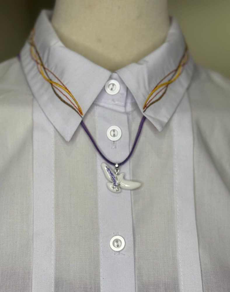 Ніжна прикраса з підвіскою у формі пташки — це легкий і витончений аксесуар, який додає образу спокою, м’якості та особливого шарму. Білий колір підвіски виглядає охайно й елегантно, а фіолетовий розпис із рослинним мотивом робить прикрасу ніжною та виразною.