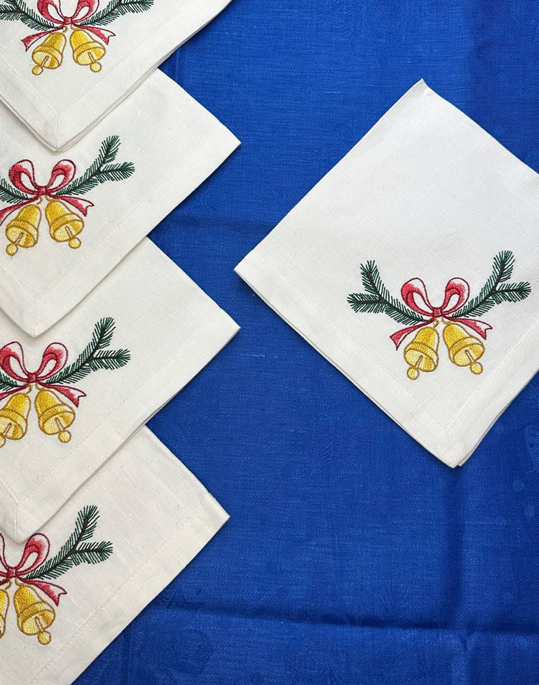 Різдвяна новорічна серветка з вишивкою дзвоників — це стильний та символічний елемент святкового декору для різдвяного і новорічного столу. Класичний мотив із золотими дзвіночками, червоною стрічкою та зеленими гілочками створює атмосферу затишку, тепла і свята, яку так цінують у період Різдва.