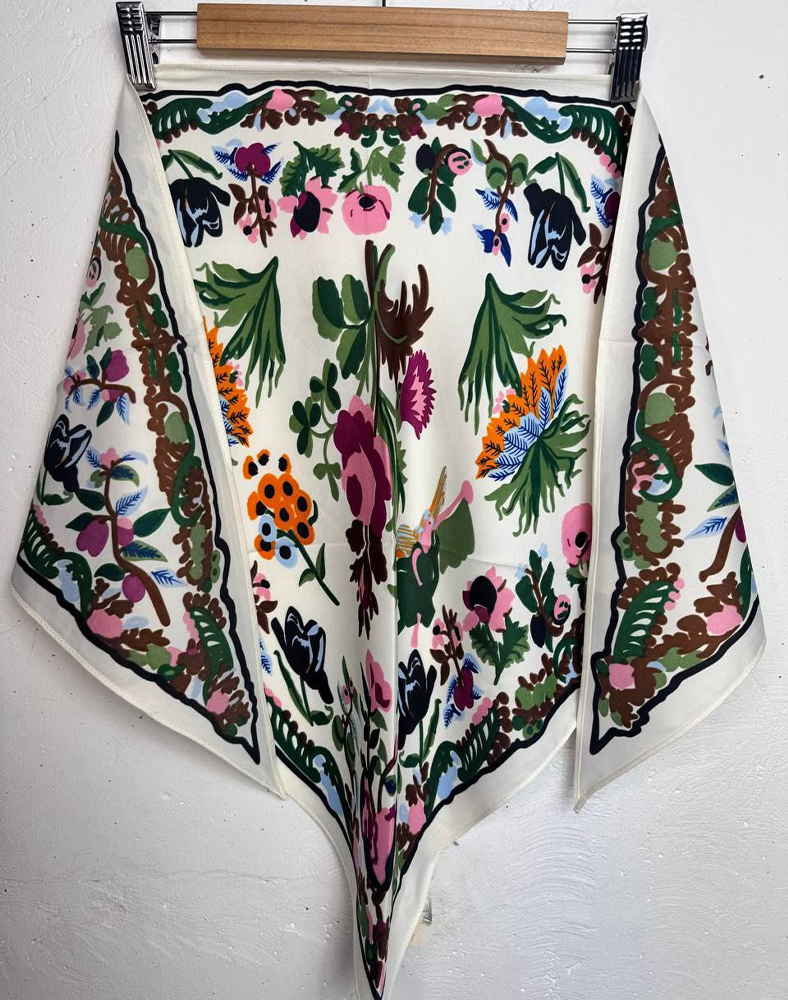Яскрава стильна косинка кремового кольору з оригінальним квітково-рослинним орнаментом — це модний аксесуар, який додає образу свіжості та індивідуальності. Світлий фон прикрашений різнокольоровими декоративними елементами — квітами, листям і рослинними мотивами у відтінках зеленого, рожевого, помаранчевого та синього, що створює легку і життєрадісну композицію.