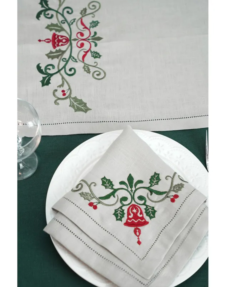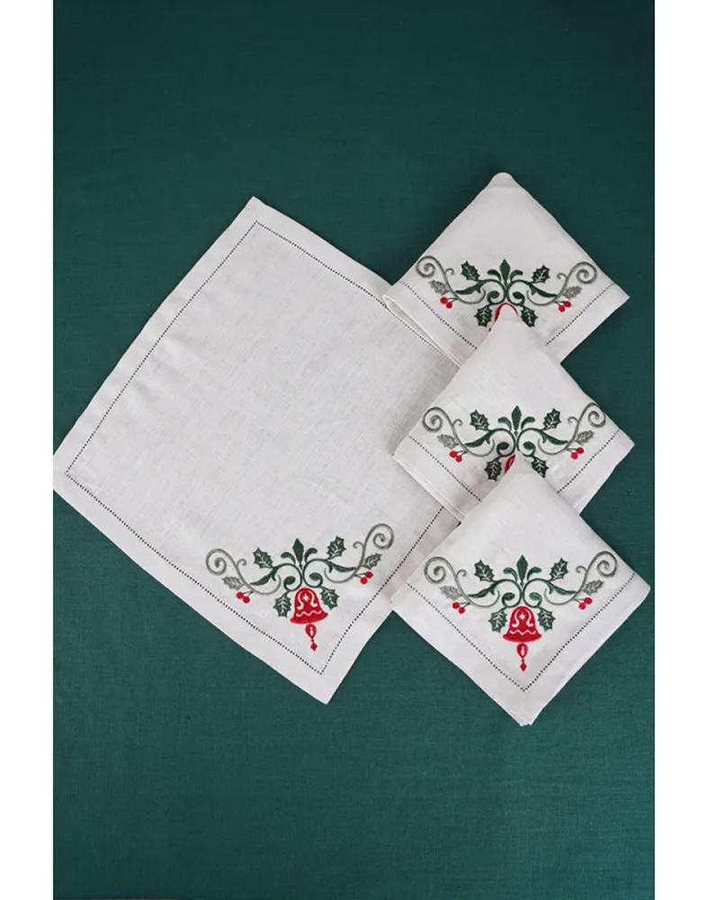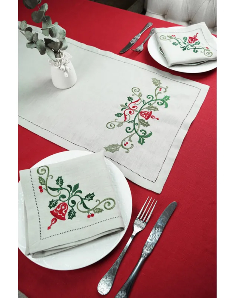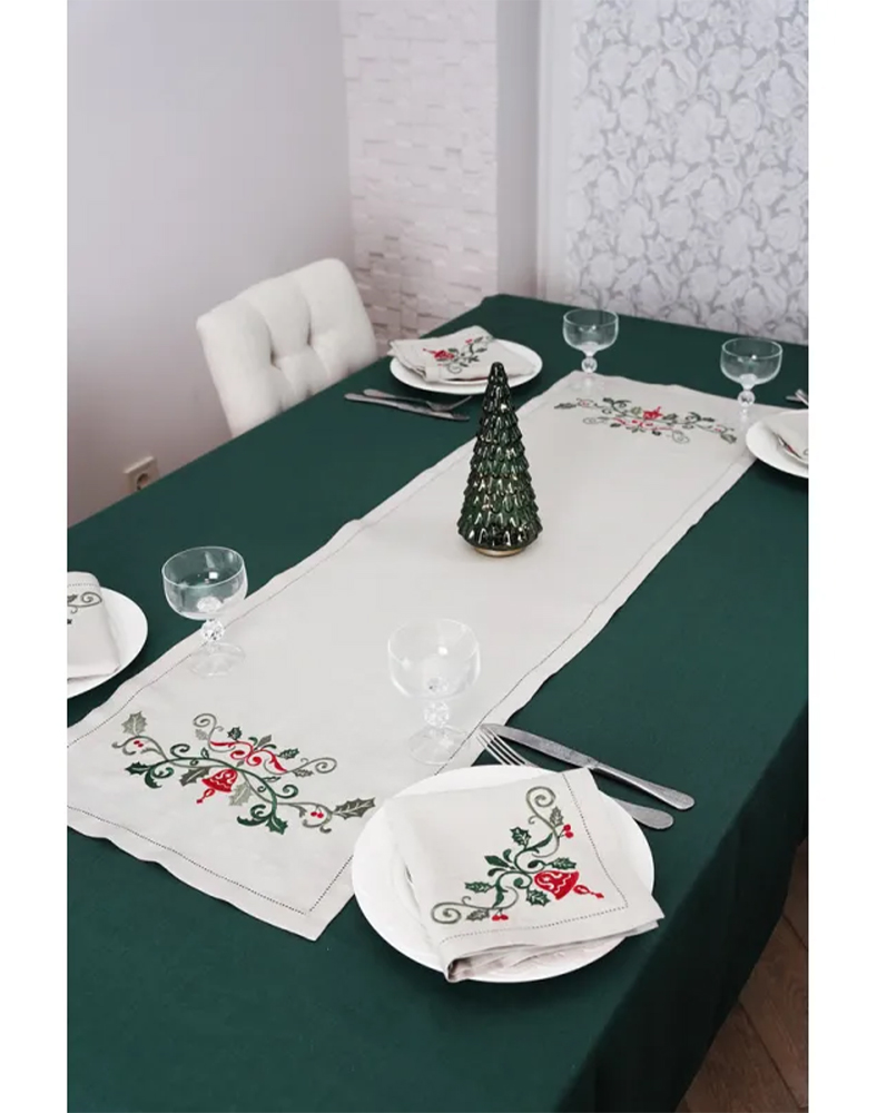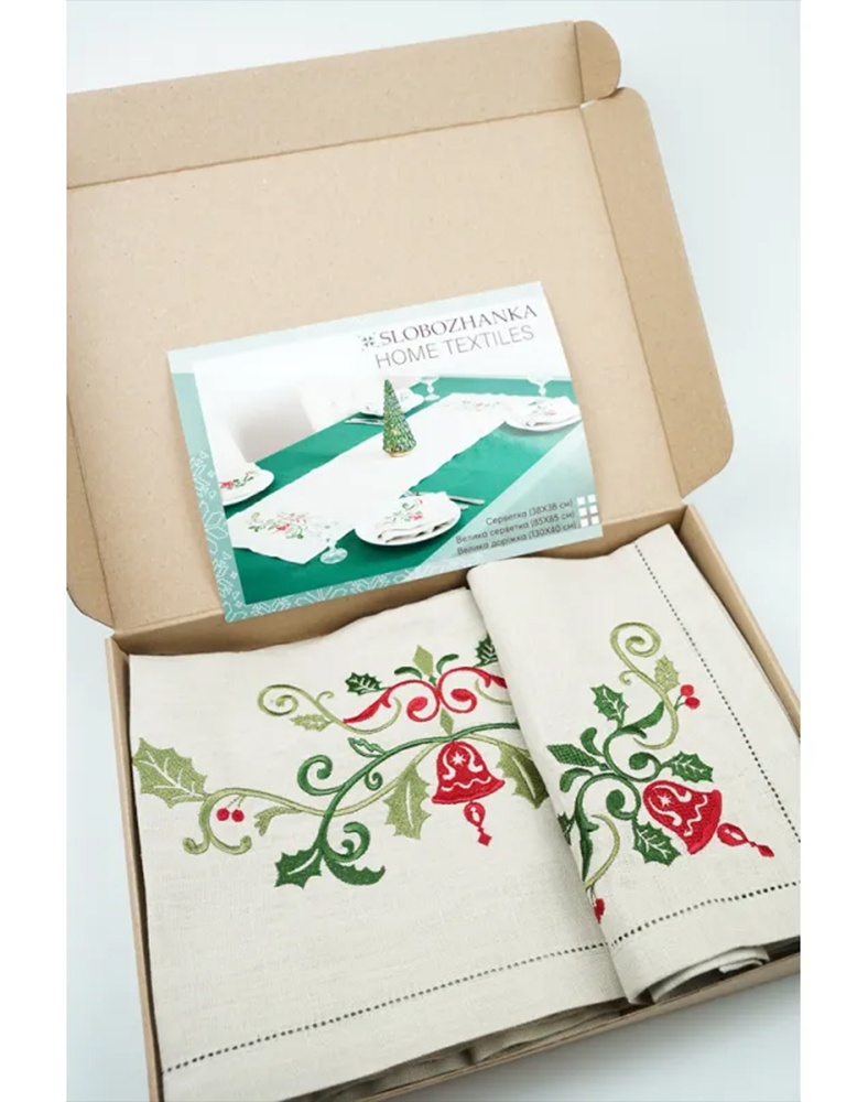 Набір столовий “Святковий” — це стильний та практичний комплект для новорічної та різдвяної сервіровки. До набору входить доріжка 130×40 см та 4 лляні серветки 38×38 см, виконані з натурального бежевого льону. Кожен елемент оздоблений тематичною святковою вишивкою та акуратною мережкою по краях, що додає виробам витонченості та преміального вигляду.