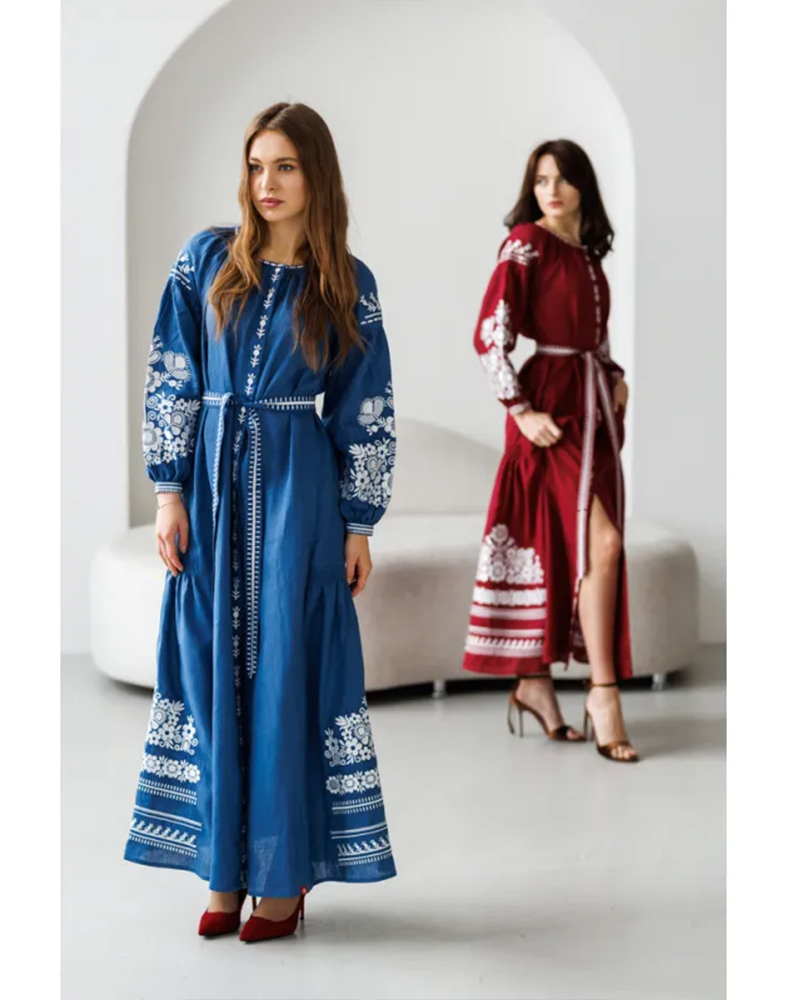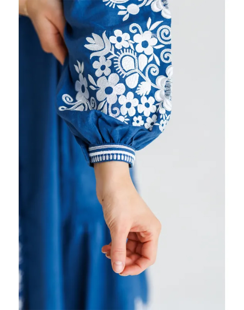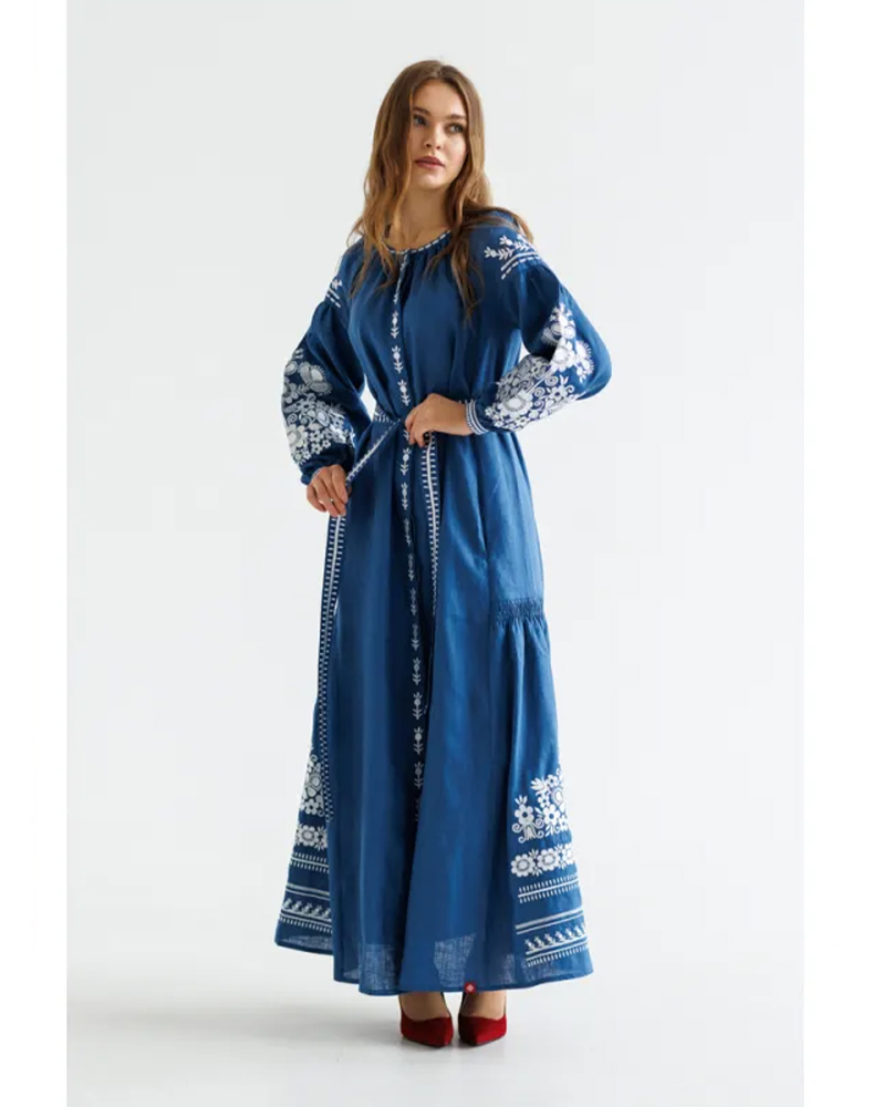 Вишивку виконано у кількох техніках — полтавська двобічна гладь, рушниковий шов, стрічка і стебельчастий шов, що створює багатий рослинно-геометричний орнамент. Сукня виготовлена зі 100% натурального льону насиченого синього кольору, який чудово пропускає повітря й забезпечує комфорт навіть у спеку.