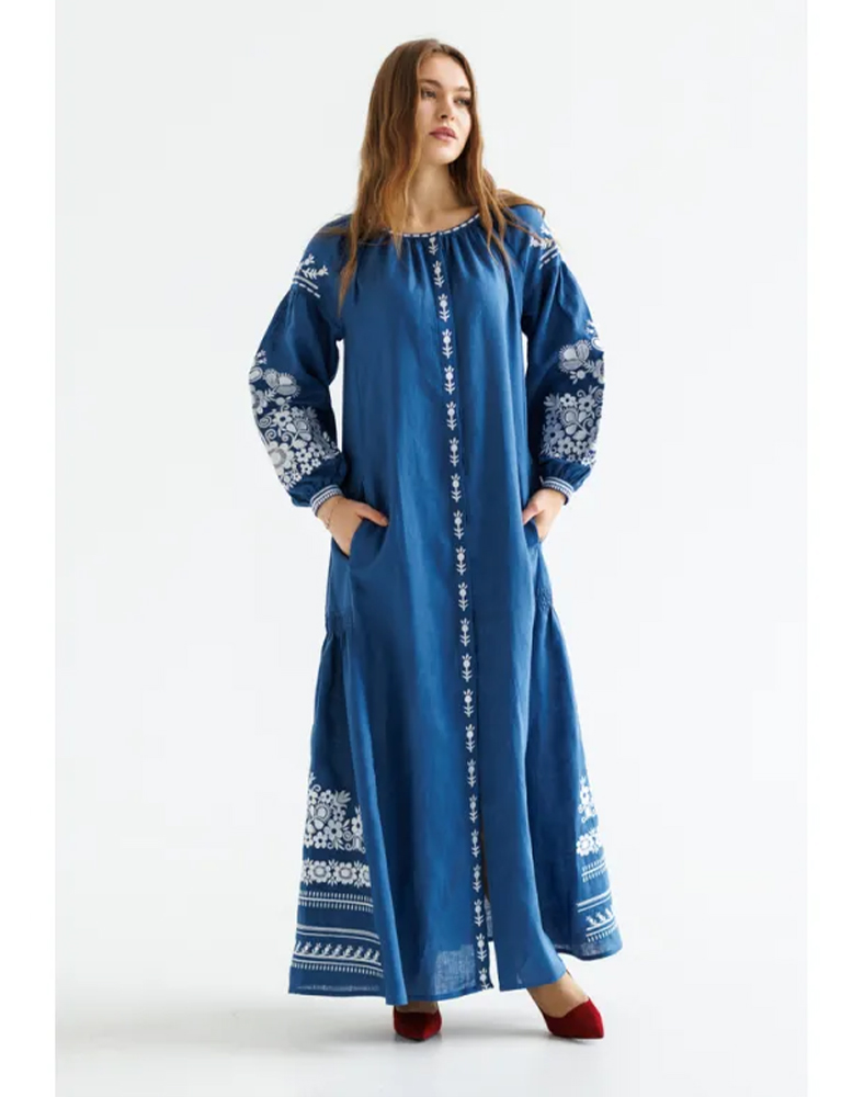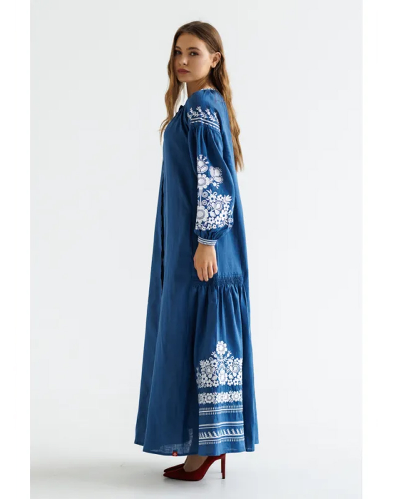 Сукня-вишиванка жіноча (0025) — довга синя лляна сукня з вишивкою «Дерево життя»