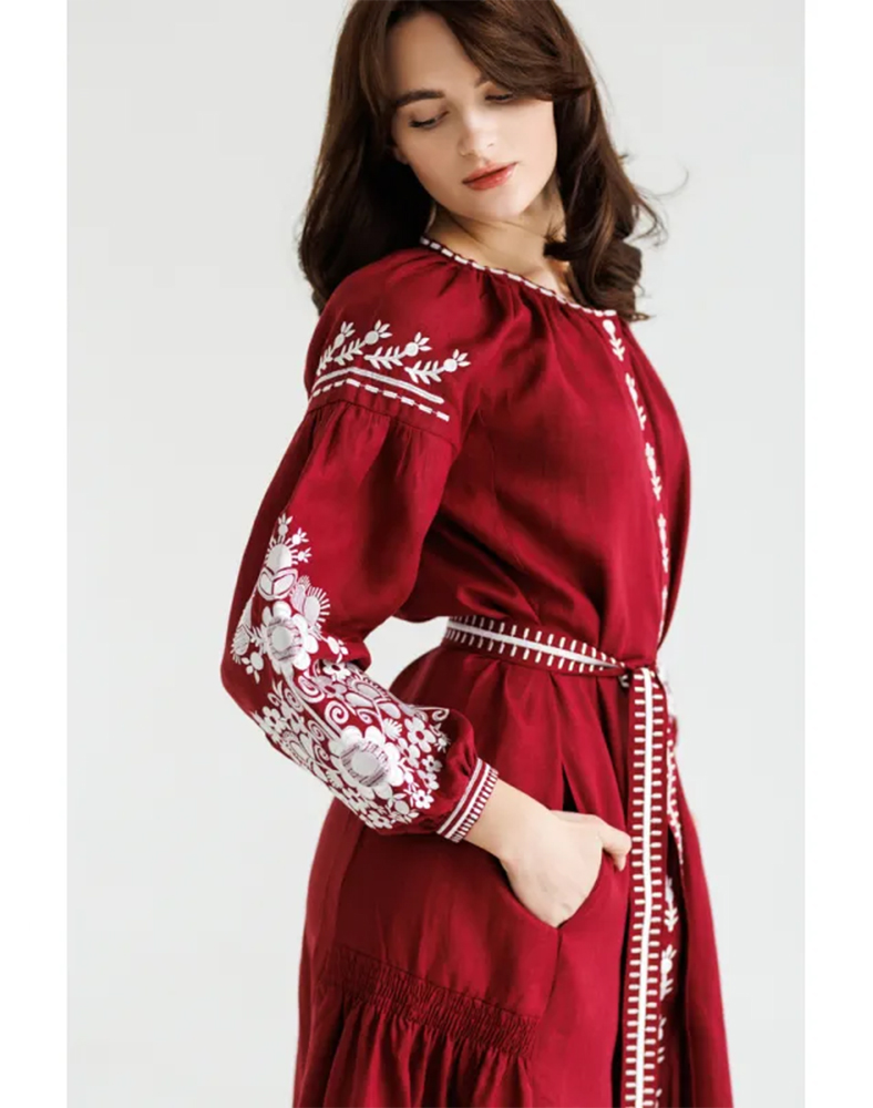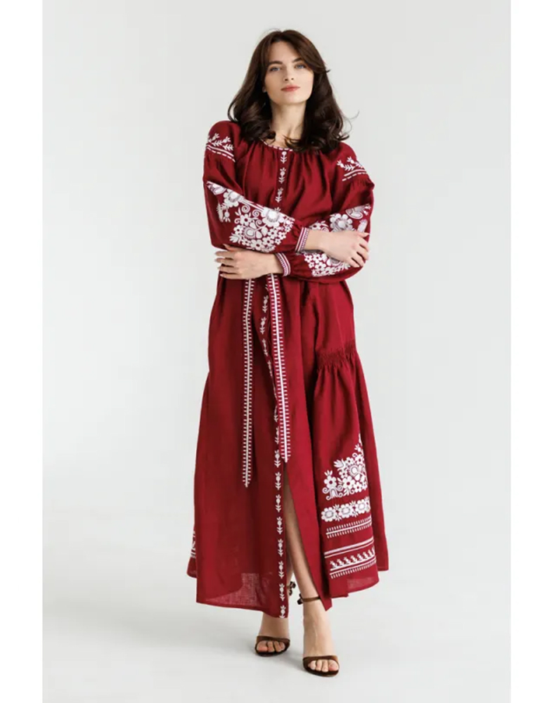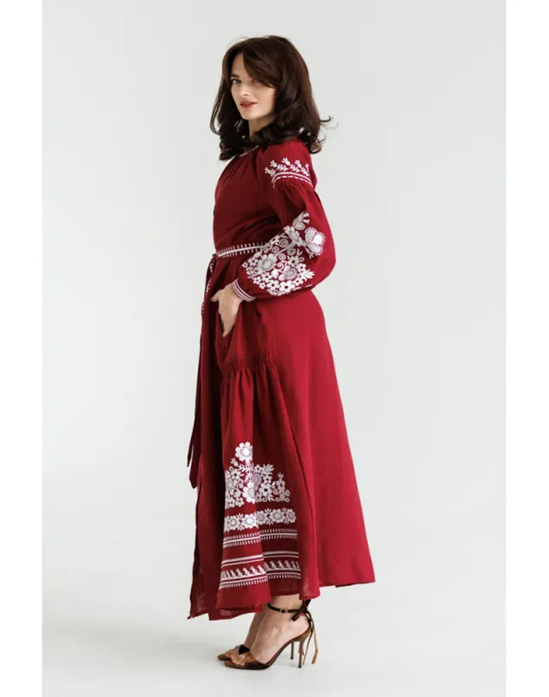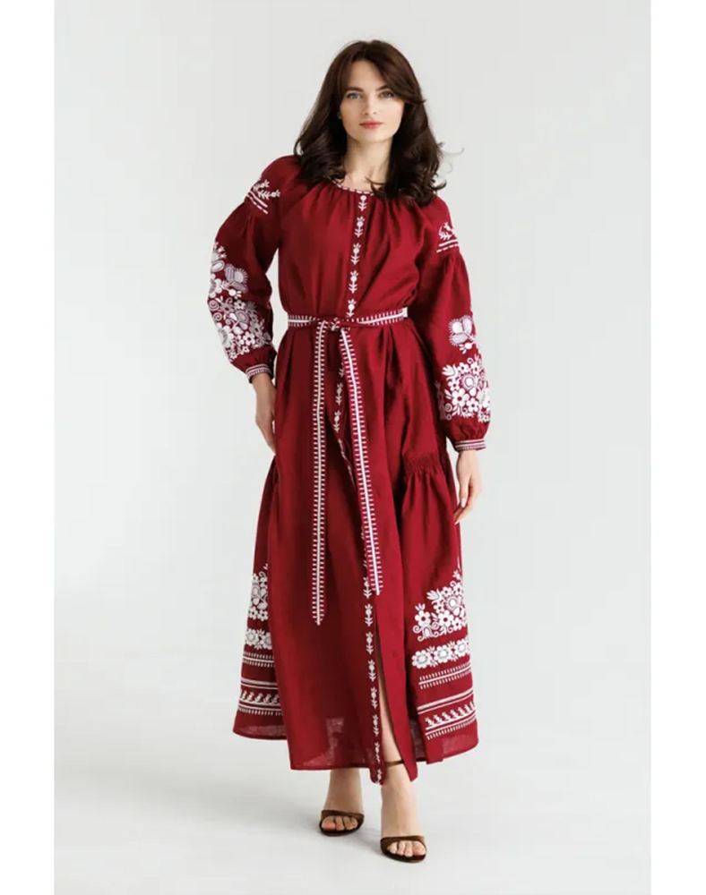 Сукня-вишиванка жіноча (0026) — бордова довга лляна сукня з білим орнаментом «Дерево життя»
