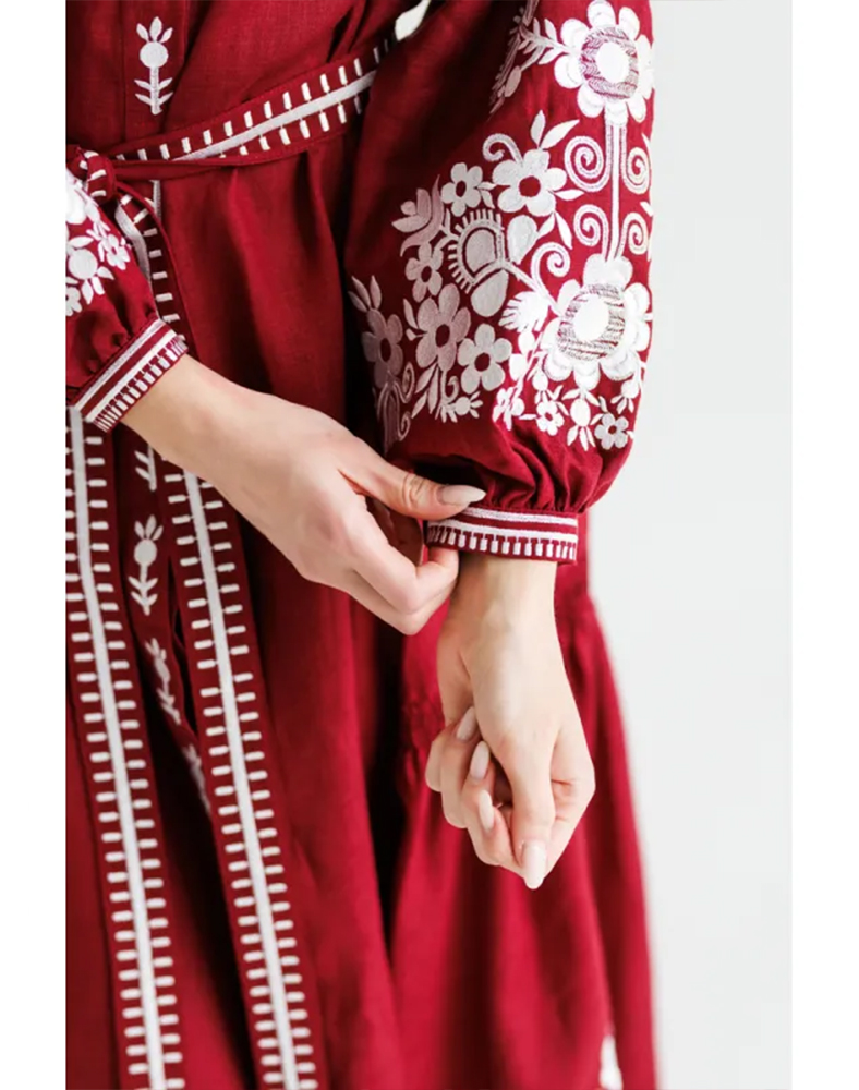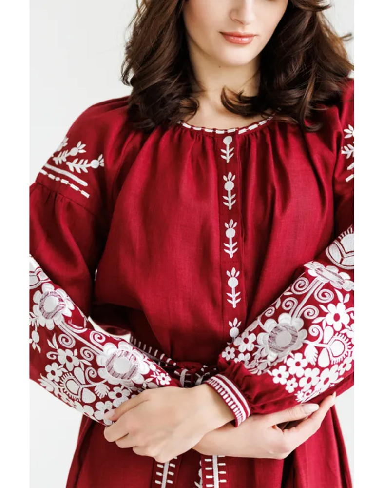 Елегантна жіноча сукня-вишиванка (0026) у бордовому кольорі — це поєднання глибокої символіки, вишуканого стилю та автентичної української традиції. Центральним елементом орнаменту є Дерево життя — прадавній символ єдності поколінь, безперервності життя й духовної сили. Білий орнамент на насиченому бордовому тлі створює гармонійний контраст і підкреслює витонченість виробу.