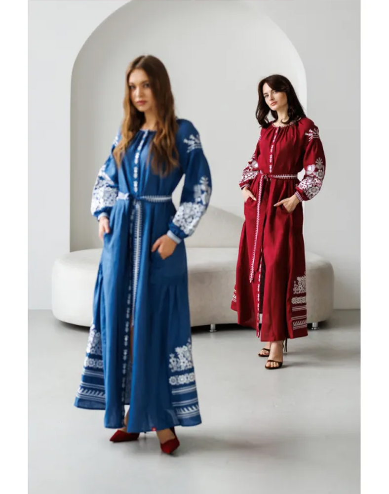 Сукня пошита зі 100% натурального льону, який приємний до тіла, добре пропускає повітря й не парить. Довгий пишний рукав прикрашений багатою вишивкою, а пасок із візерунковими стрічками додає акцент на талії. Вільний крій максі забезпечує комфорт і підходить до будь-якого типу фігури.