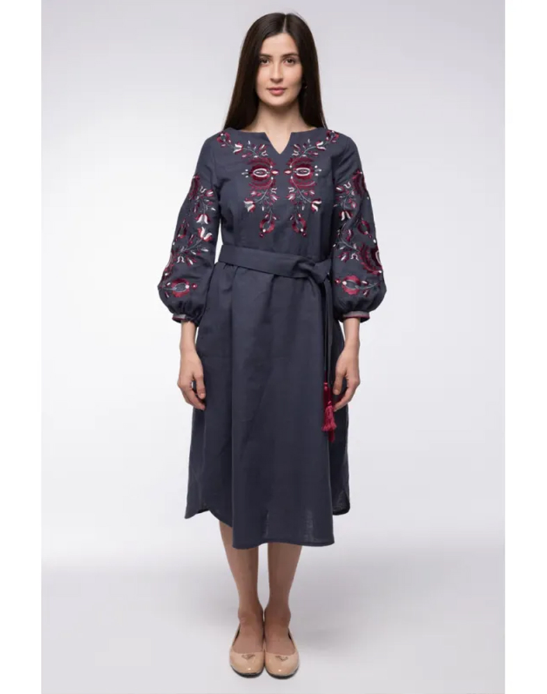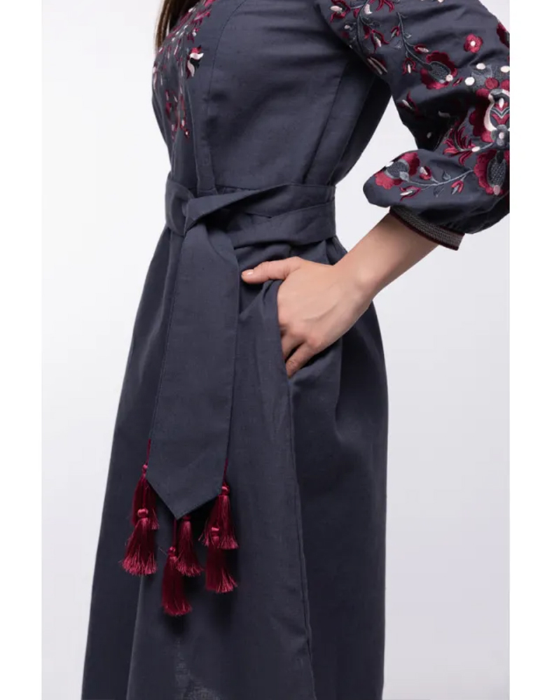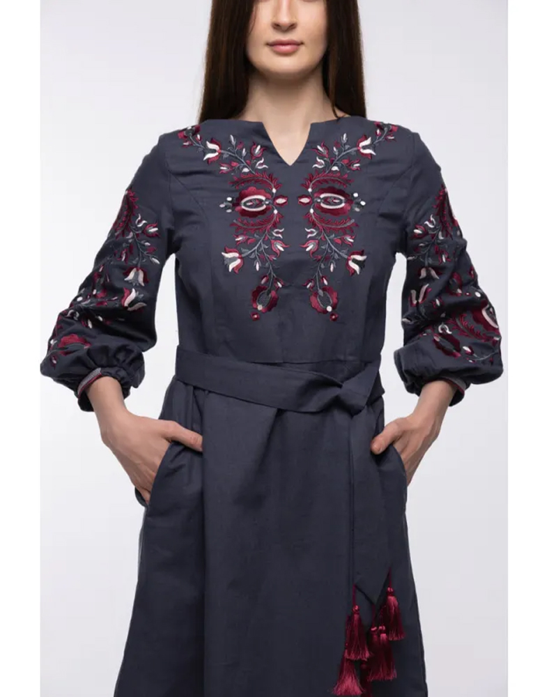 Сукня має вільний крій із широким поясом і китицями, які акцентують талію. Об’ємні рукави 3/4 з манжетами рясно оздоблені вишивкою, а V-подібний виріз горловини візуально подовжує шию й підкреслює жіночність. Зручні кишені по боках додають практичності у повсякденному носінні.