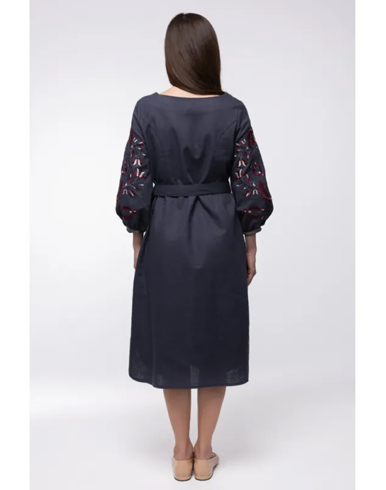 Сучасна жіноча сукня-вишиванка (5026) створена за мотивами орнаментів Козацької доби XVII–XVIII століття. Її головна особливість — поєднання глибокого антрацитового відтінку натурального льону з яскравою бордово-синьою вишивкою, виконаною в техніці подвійної гладі. Орнамент із рослинними мотивами символізує гармонію, силу й духовність, додаючи виробу етнічного шарму.