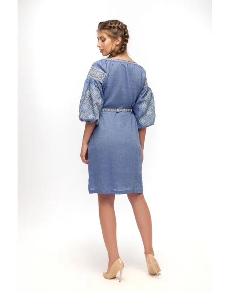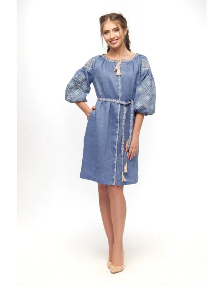 Жіноча сукня-вишиванка «Іванна» — втілення сучасної української моди, де поєднано легкість, традицію й природну гармонію. Модель виконана зі 100% льону джинсово-блакитного кольору, що нагадує відтінок літнього неба та надає образу свіжості й невимушеності.