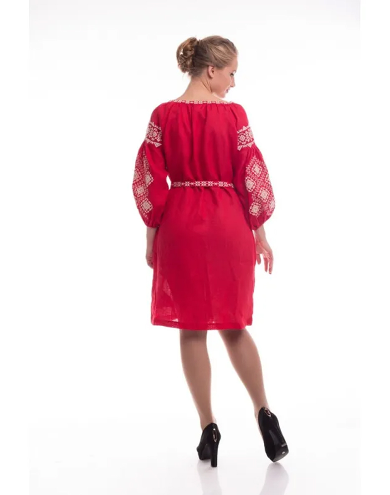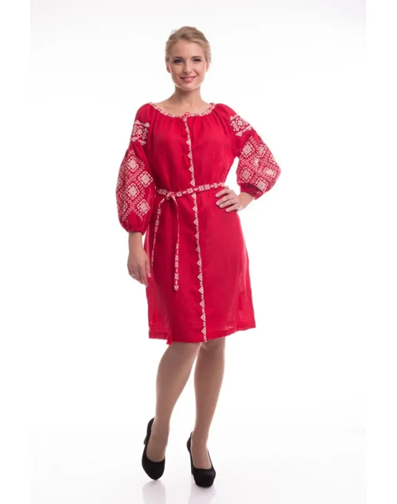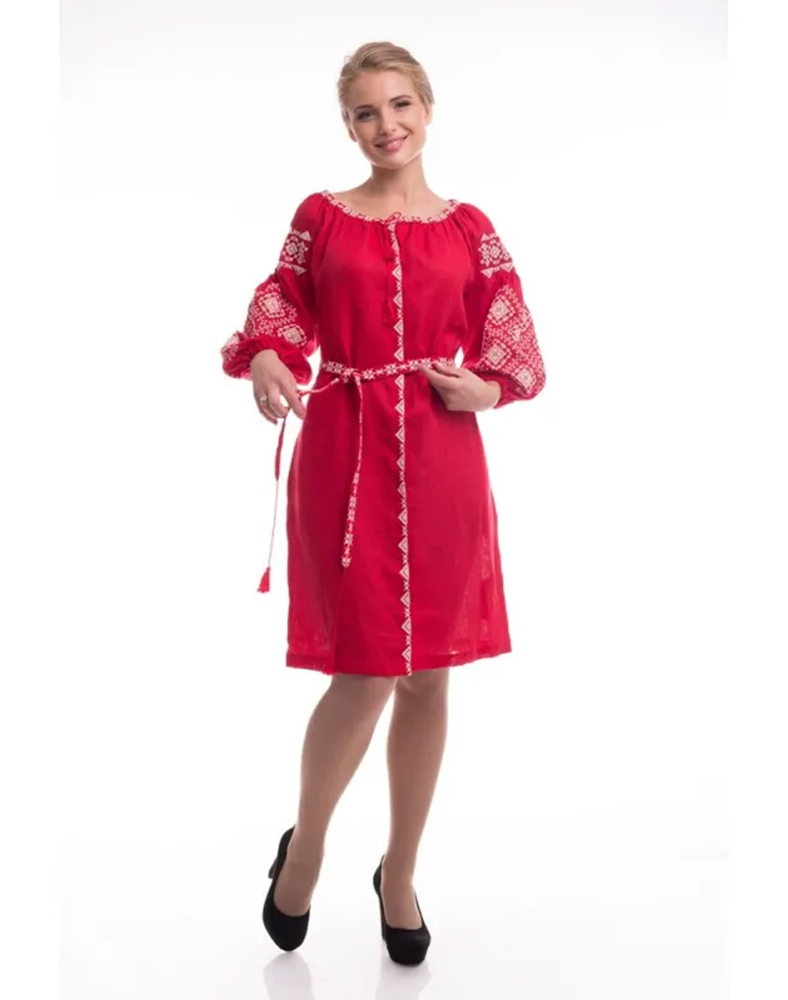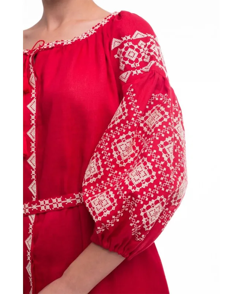 Жіноча сукня-вишиванка «Іванна» — це яскрава інтерпретація українських традицій у сучасному стилі. Модель виготовлена зі 100% натурального льону насиченого червоного кольору, який символізує любов, енергію та життєву силу. Контрастна біла вишивка з геометричними орнаментами підкреслює національний характер виробу й додає йому виразності.