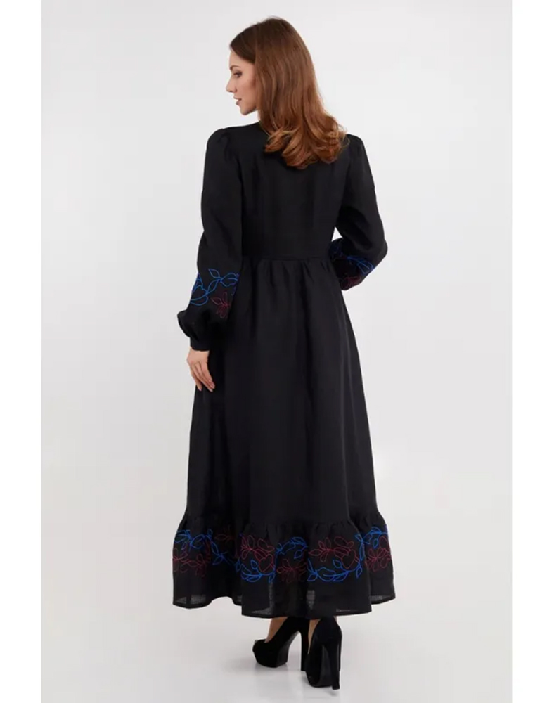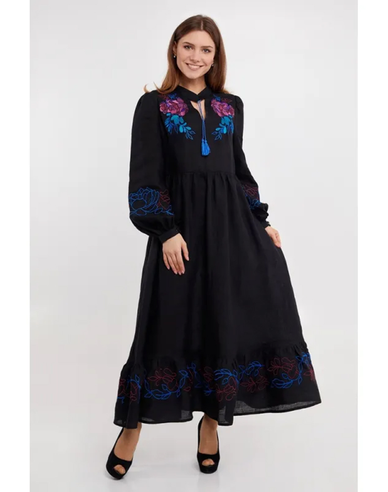 Сукня-вишиванка жіноча «Піона» — чорна лляна сукня з яскравою вишивкою (довгий рукав)
