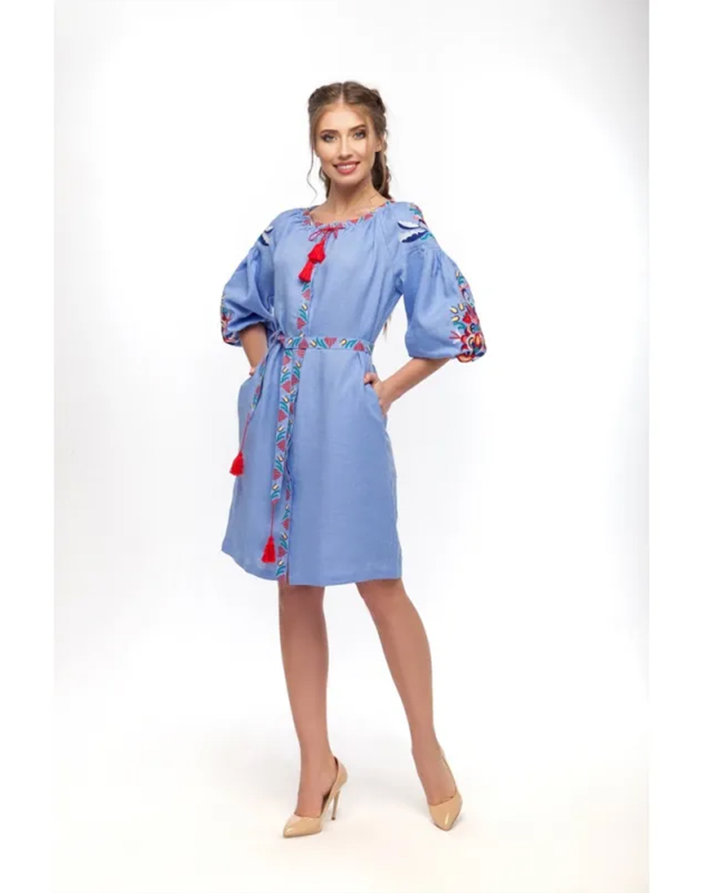 Сукня має вільний крій, що ідеально приховує недоліки фігури, та рукав реглан довжиною 3/4 із вишивкою. Декорована поясом із вишитим орнаментом і китицями, який підкреслює талію та додає жіночності. Горловина оздоблена крученими шнурами з китицями, а застібки-ґудзики на спинці забезпечують зручність у носінні.