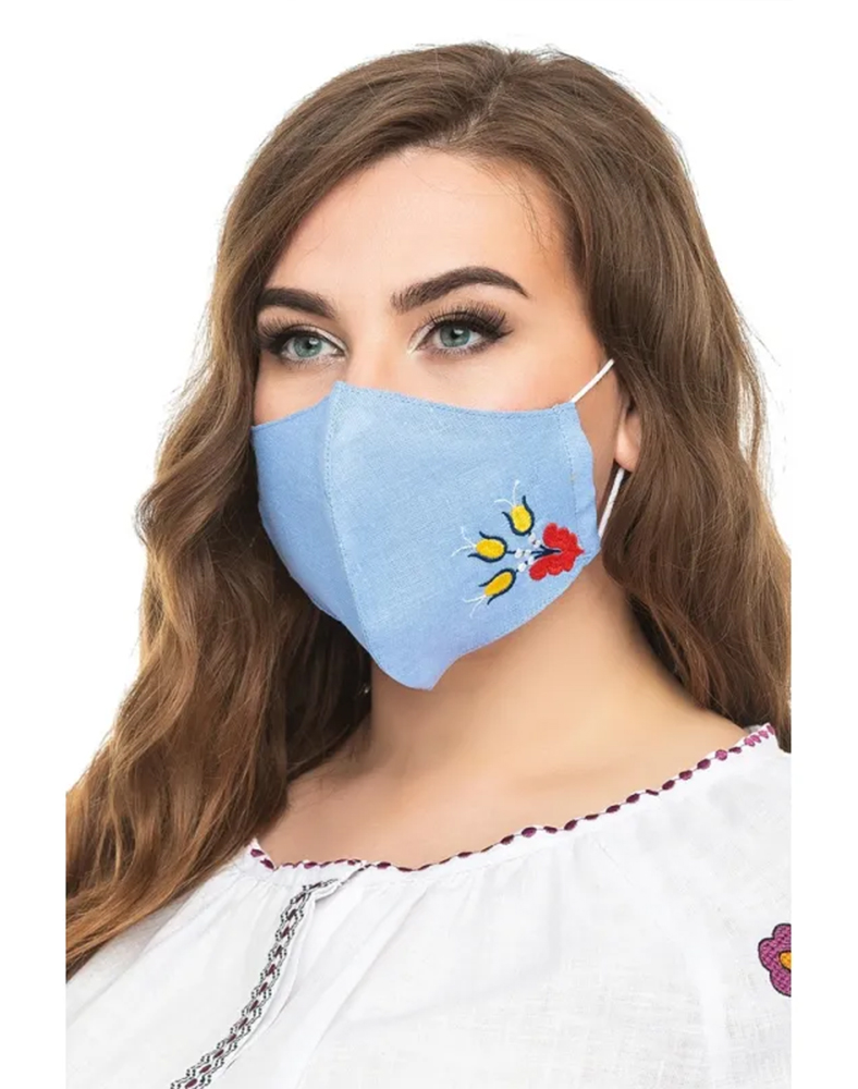 Вишивка виконана у відтінках червоного, синього та чорного, що створюють гармонійний контраст із кольором тканини. Орнамент із барвистими квітами й символом Берегині уособлює материнську силу, жіночу енергію та гармонію трьох світів.