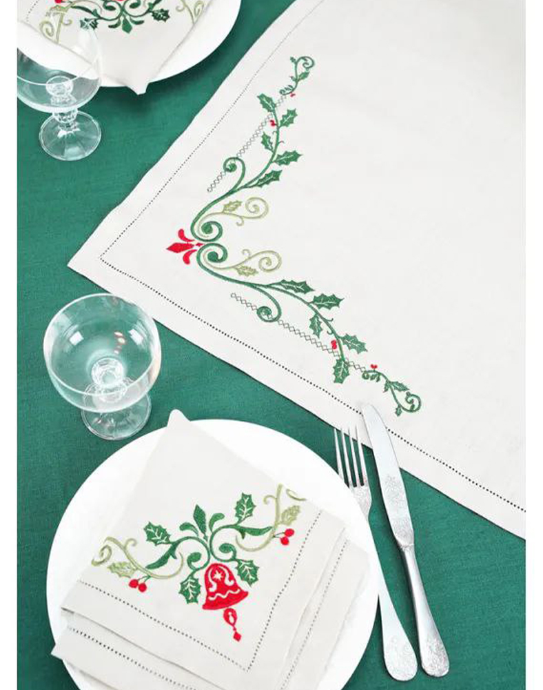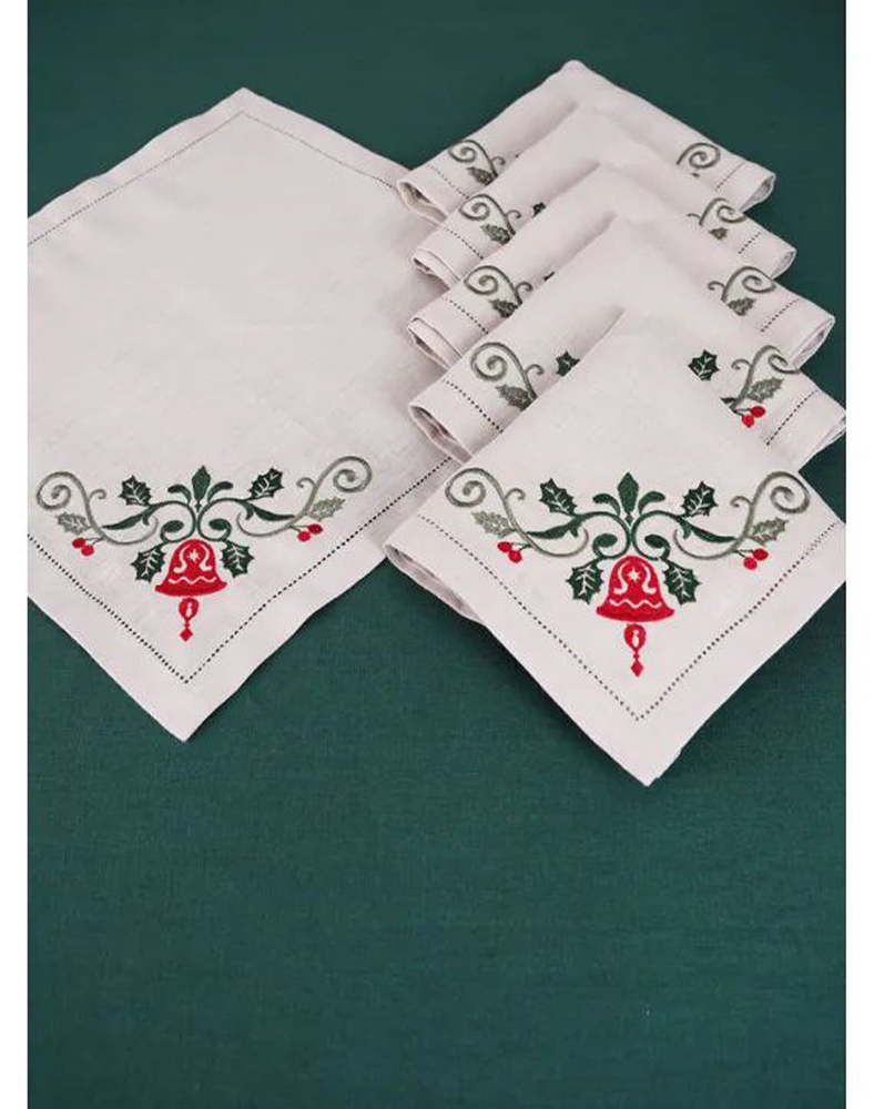 Святковий набір лляних серветок з вишивкою — це елегантний акцент для сервірування столу на Різдво, Новий рік або сімейні урочистості. Класичний бежевий льон у поєднанні з декоративною вишивкою у святкових мотивах створює атмосферу затишку, тепла й домашнього свята.