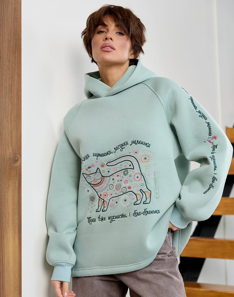 Тепле м’ятне худі з милим вишитим котиком – зручний і стильний варіант для кожного дня. Модель оверсайз, м’яка, тепла і дуже комфортна. Турецька утеплена тканина добре гріє, не кошлатиться і приємна до тіла. Подвійний капюшон забезпечує додатковий затишок, а яскрава казкова вишивка з котиком додає особливого настрою.