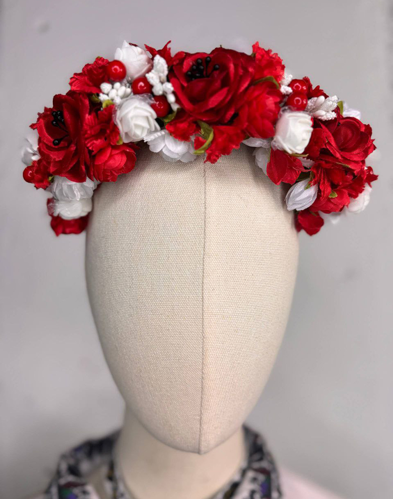 Український віночок ручної роботи у класичному червоно-білому поєднанні — це традиційний жіночий головний убір, який символізує любов, чистоту та життєву силу. Червоні й білі квіти створюють виразний, святковий образ, добре впізнаваний в українській культурі.