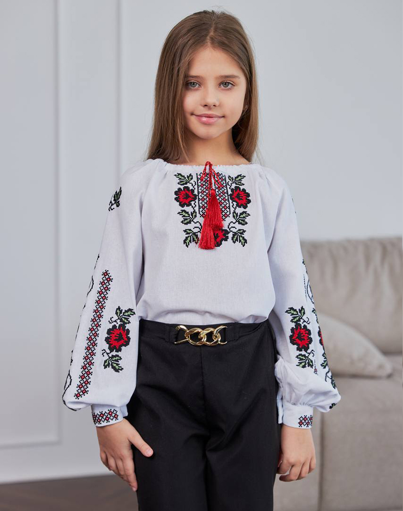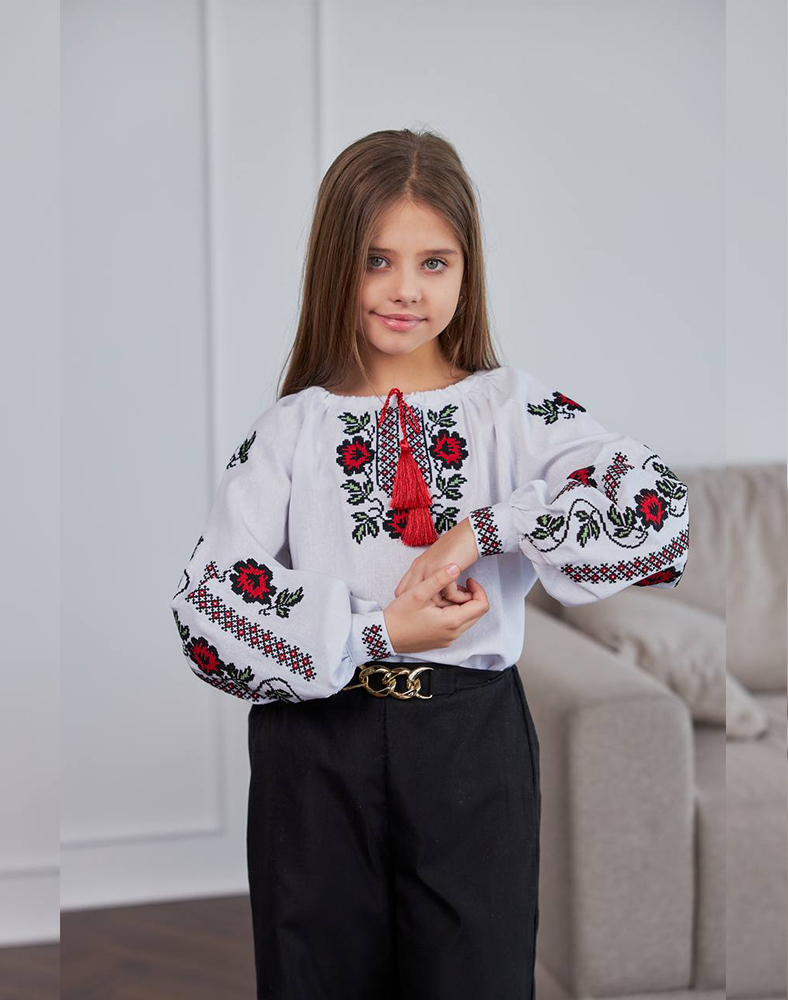 Яскрава вишивка червоними й зеленими нитками з мотивами півонії підкреслює українські традиції та створює святковий образ. Завдяки зручному крою та довгому рукаву ця дитяча вишиванка однаково добре пасує для школи, святкових заходів, виступів і фотосесій.