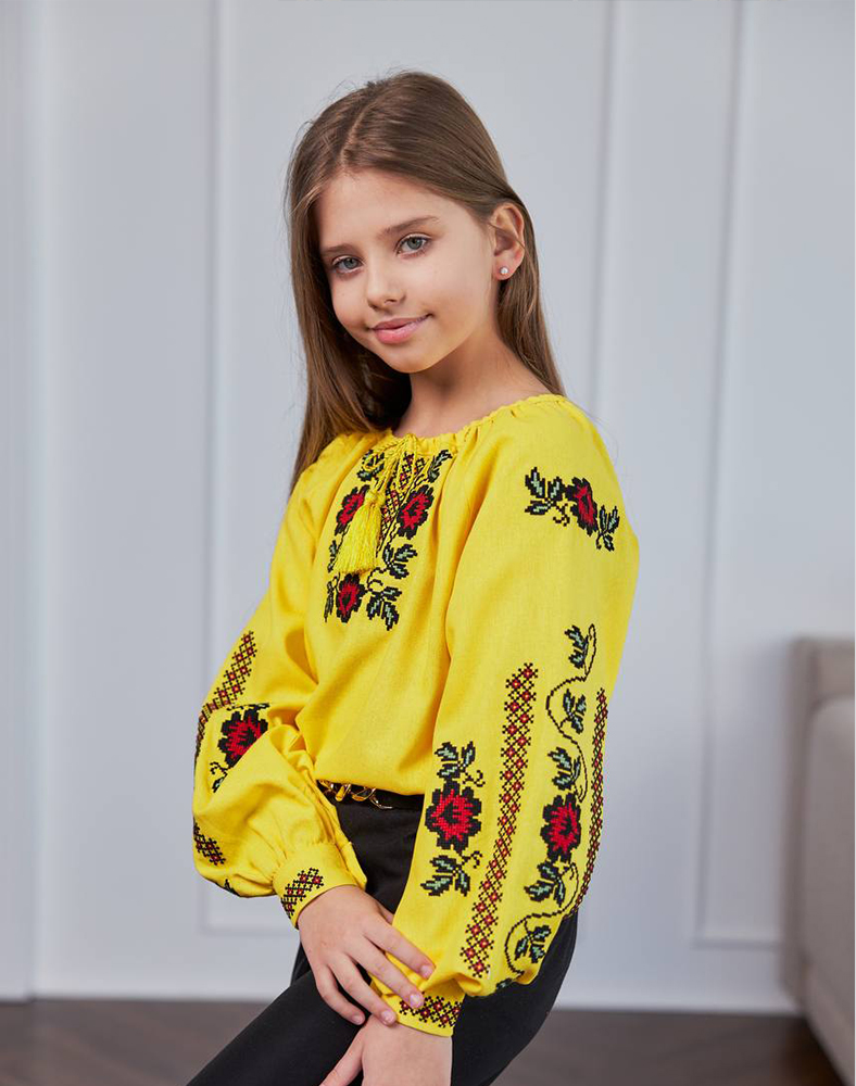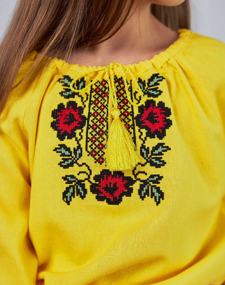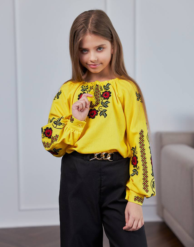Вишиванка «Півонія» у яскравому жовтому кольорі створює сонячний настрій і додає образу святковості. Червоні та чорні візерунки у вигляді півоній, виконані хрестиком, виглядають виразно та символізують красу, радість і життєву силу. Вільний крій та м’яка натуральна тканина забезпечують комфорт, а пишні рукави додають легкості та ніжності.