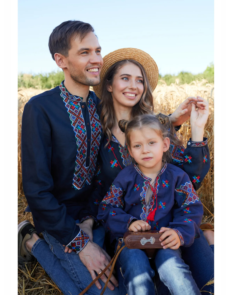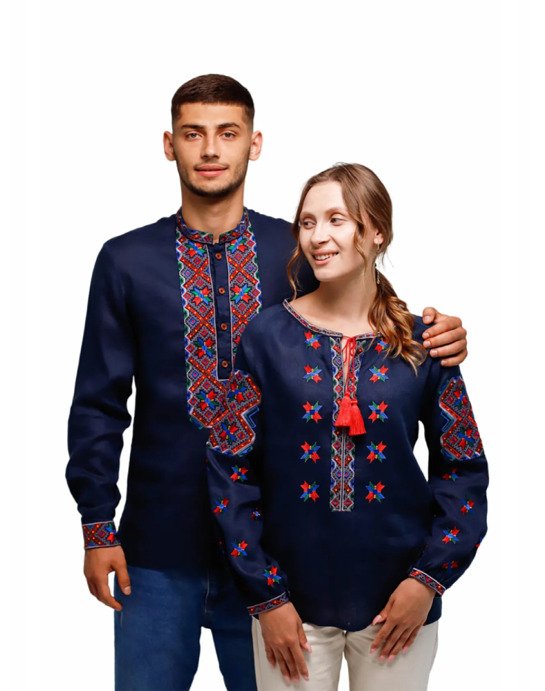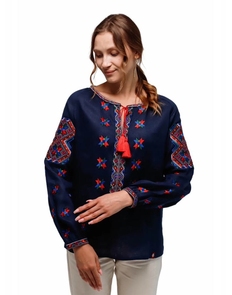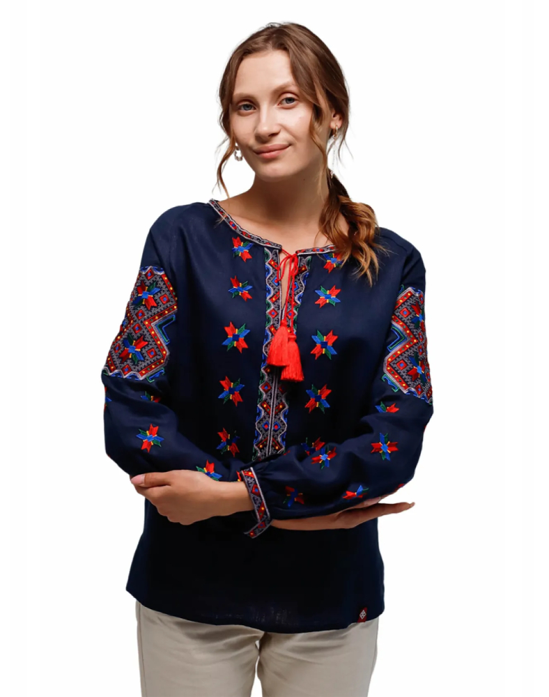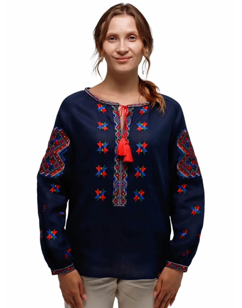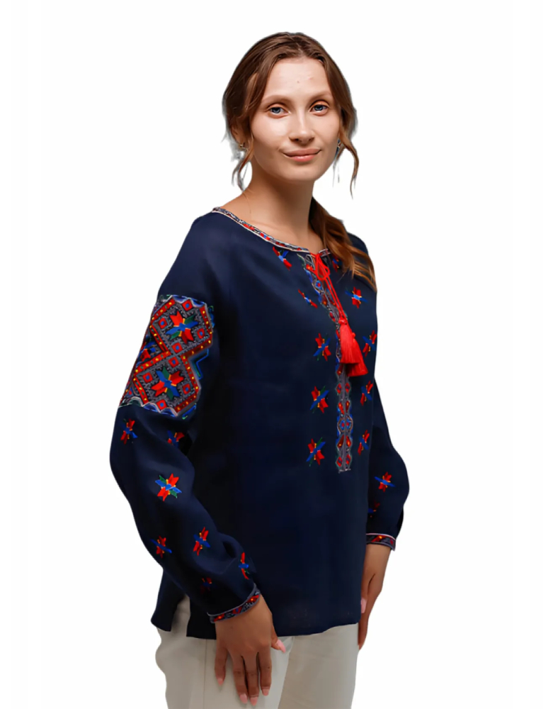 Вишиванка жіноча 7401 — це виразна модель у темно-синьому кольорі, створена за мотивами гуцульської вишивки початку ХХ століття. Вона поєднує глибокий колір натурального льону, насичену багатоколірну вишивку та характерну декоративність, властиву традиціям Гуцульщини. Така сорочка виглядає яскраво, самобутньо й водночас дуже гармонійно, підкреслюючи індивідуальність та любов до української культури.