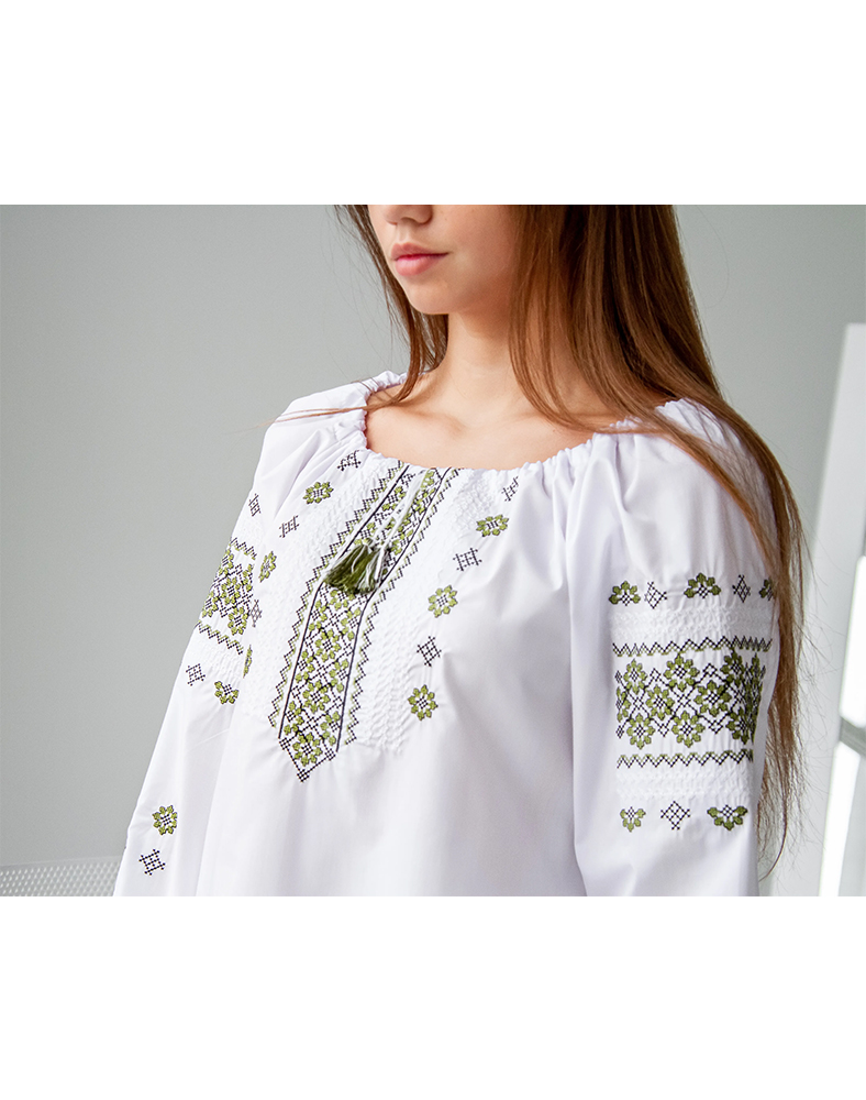Витончена модель, яка поєднує класичну білизну тканини та вишукану оливкову вишивку.