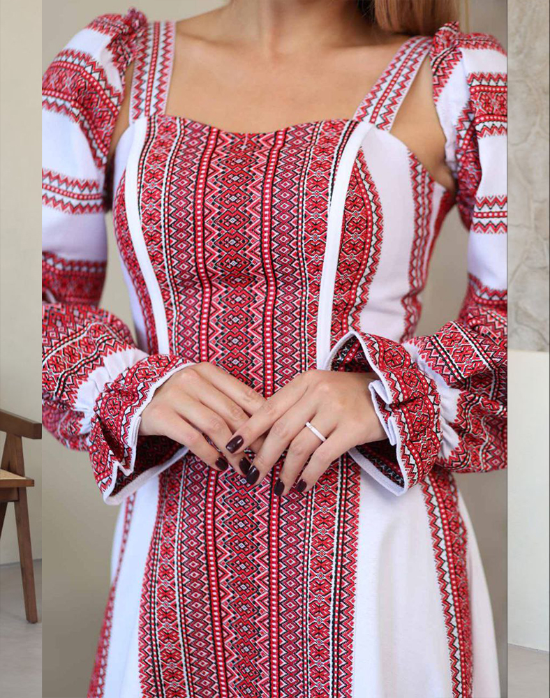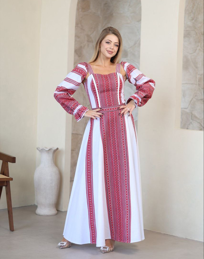 Корсетна основа красиво підкреслює лінію талії та формує гарний силует, а довга спідниця додає образу легкості та шляхетності. Контрастна червоно-біла вишивка з етнічними мотивами витончено прикрашає ліф, рукави та центральну частину сукні, створюючи гармонійний, виразний акцент.