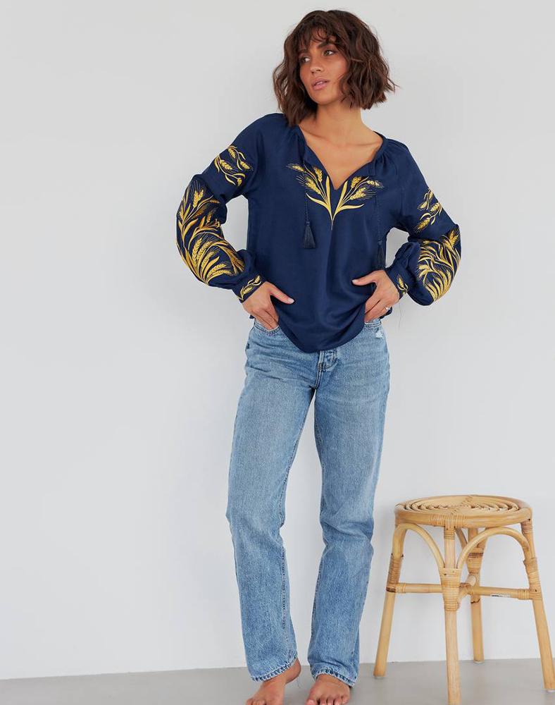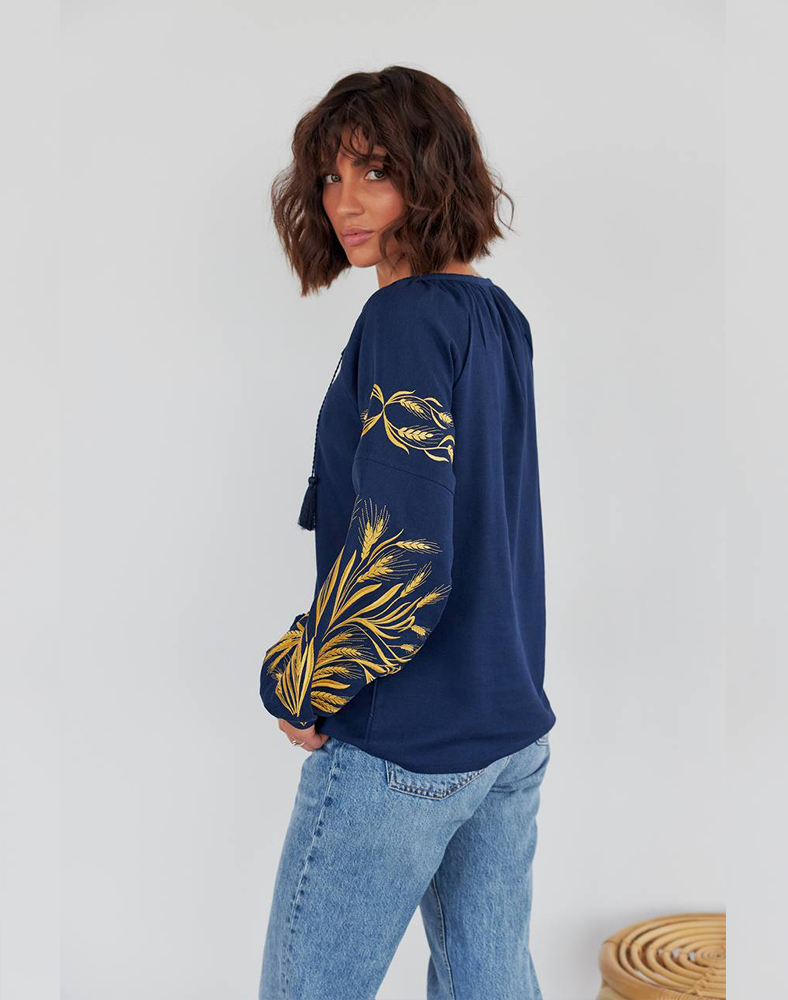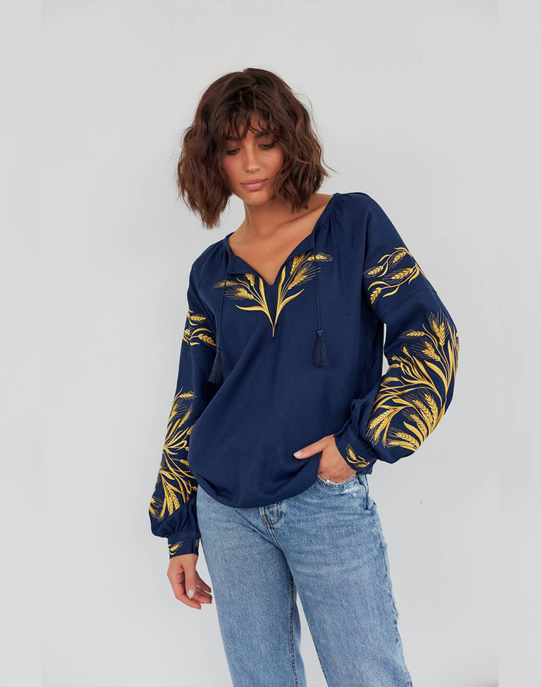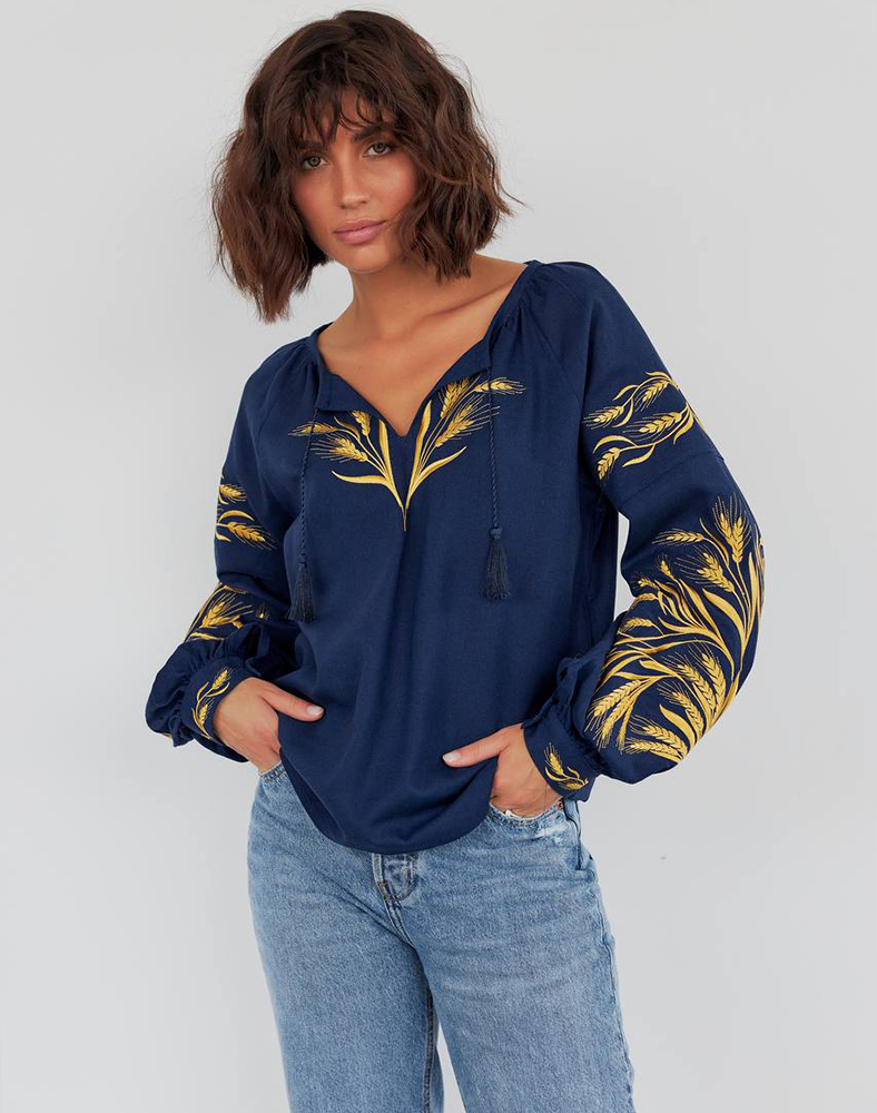 Жіноча вишита сорочка «Колосся» синя, лляна, довгий рукав