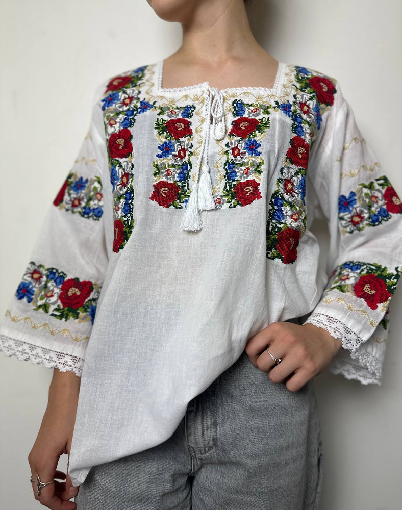 Ніжна біла вишиванка з маками та волошками — це поєднання української традиції й сучасного стилю. На полотні з натуральної бавовни розквітають яскраві червоні маки та сині волошки, що символізують красу, любов і чистоту. Машинна вишивка виконана з високою точністю, тому кожен стібок виглядає акуратно й довговічно.