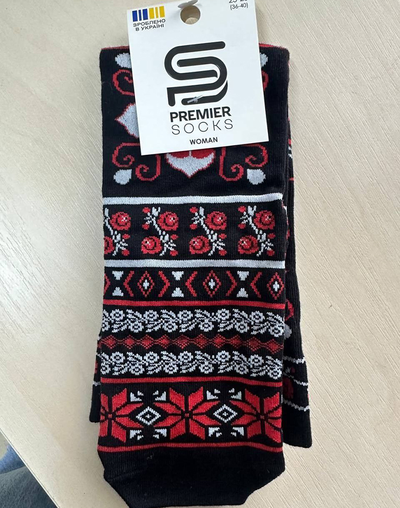 Стильні жіночі шкарпетки з яскравим етнічним орнаментом — поєднання традиційного мотиву та сучасного формату. Контрастна чорна основа з червоно-білими візерунками виглядає виразно й додає образу характеру.