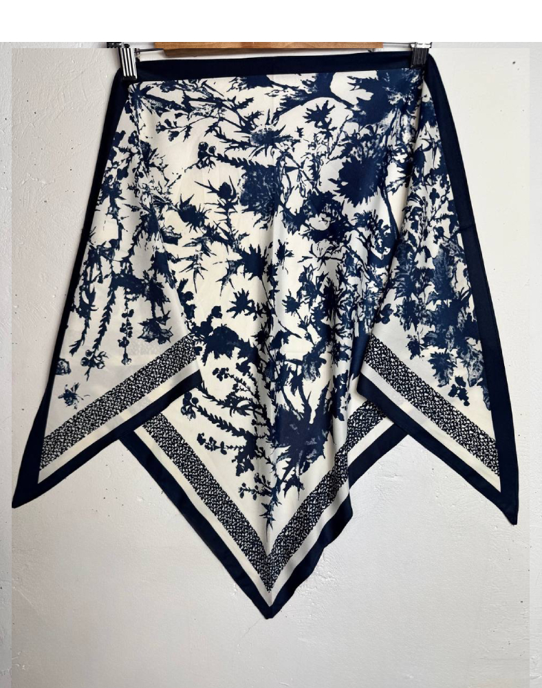 Изысканная бандана со светлым молочным фоном и глубоким тёмно-синим растительным орнаментом — это стильный аксессуар, который сочетает нежность, элегантность и современную выразительность. На светлом фоне раскрывается художественный узор из цветов, трав и растительных силуэтов, придающий изделию особое очарование и утончённый характер.