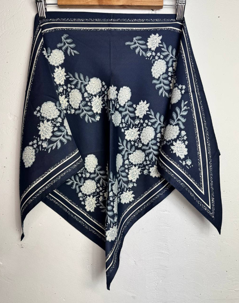 Светлый орнамент красиво контрастирует с тёмно-синим фоном, а декоративная окантовка по краю придаёт изделию завершённость и особое очарование. Такая бандана прекрасно подходит как для повседневной носки, так и для более элегантных образов. Её можно носить на голове, на шее, на плечах или использовать как стильное дополнение к сумке или верхней одежде.