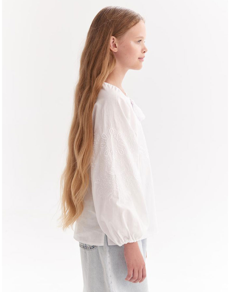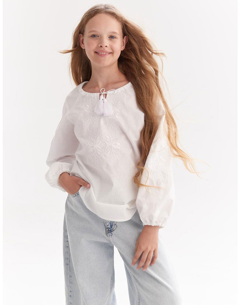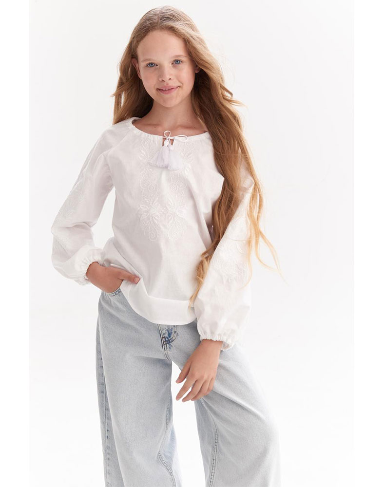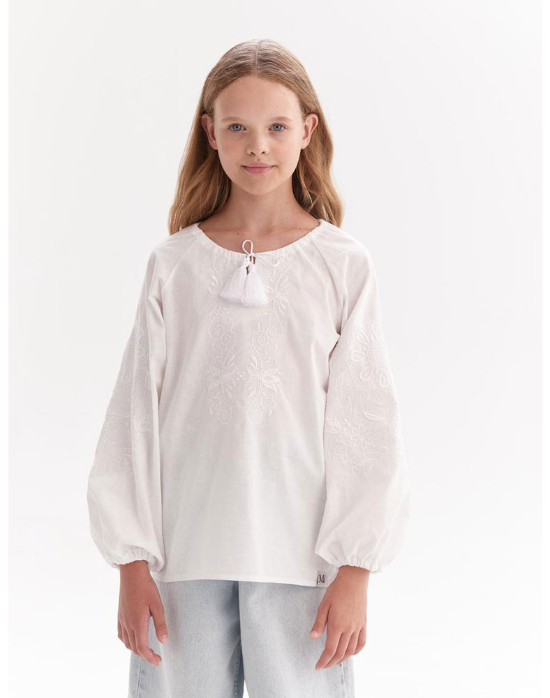 Модель сшита из натурального хлопка, который дышит и обеспечивает комфорт при повседневной носке. Объёмные рукава на мягкой резинке, горловина с лёгкой сборкой и завязками с кисточками — идеальное сочетание удобства и традиционного дизайна.