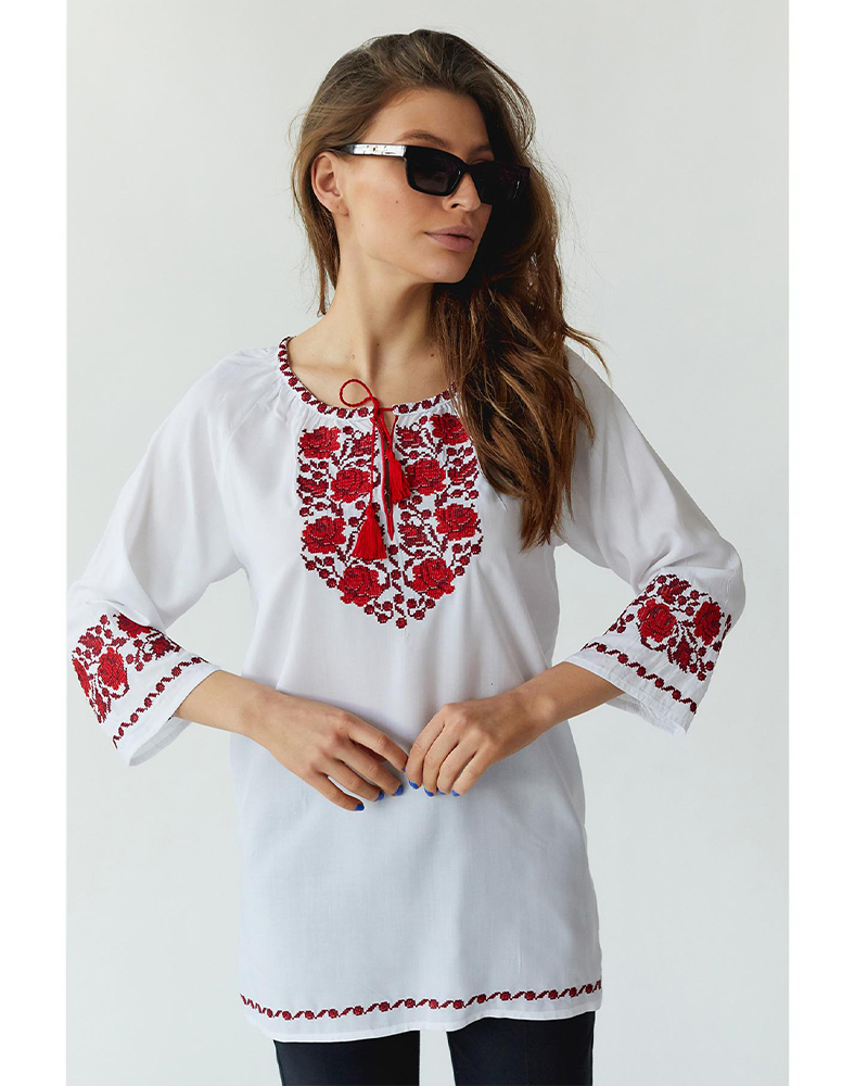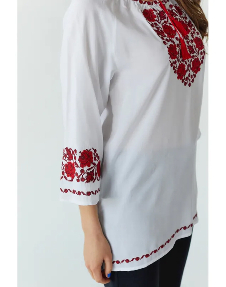 Горловина украшена аккуратной обтачкой и регулируется красивым крученым шнурком с кисточками. Вышивка выполнена традиционным крестиком: сочные красные розы украшают перед, рукава и низ блузы, создавая выразительный и в то же время гармоничный образ.