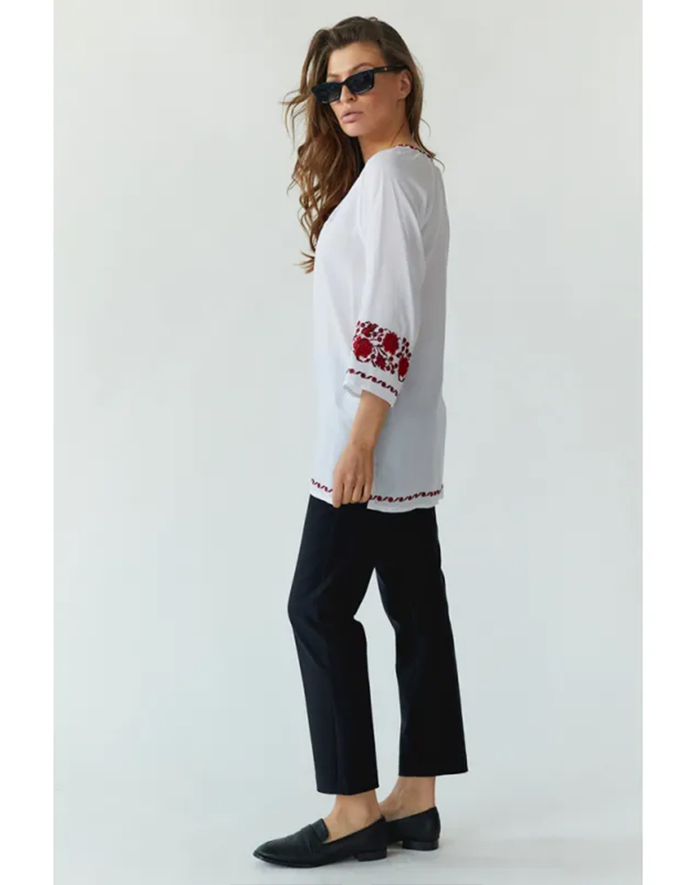 Блуза «Трояндови росы» — это нежный и женственный выбор как на каждый день, так и для праздничных моментов. Лёгкая белая ткань из штапеля мягко ложится по фигуре, не парит и приятна к телу. Модель имеет цельнокроёный фасон, прямой силуэт и удобный рукав 3/4, что делает её универсальной для тёплого сезона и межсезонья.