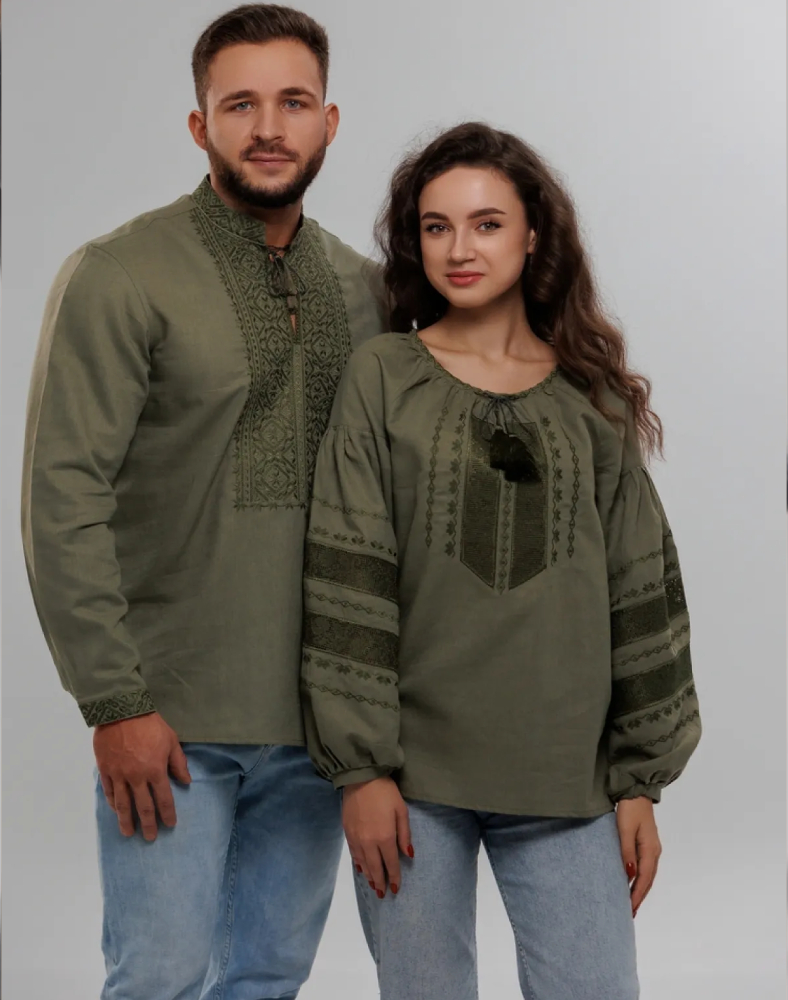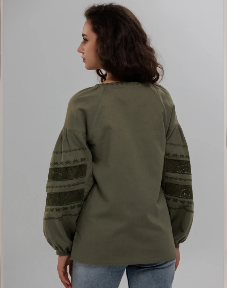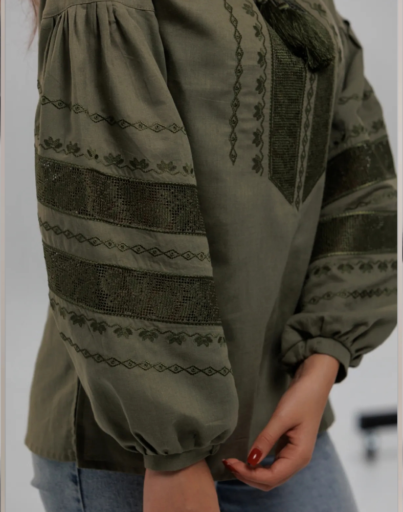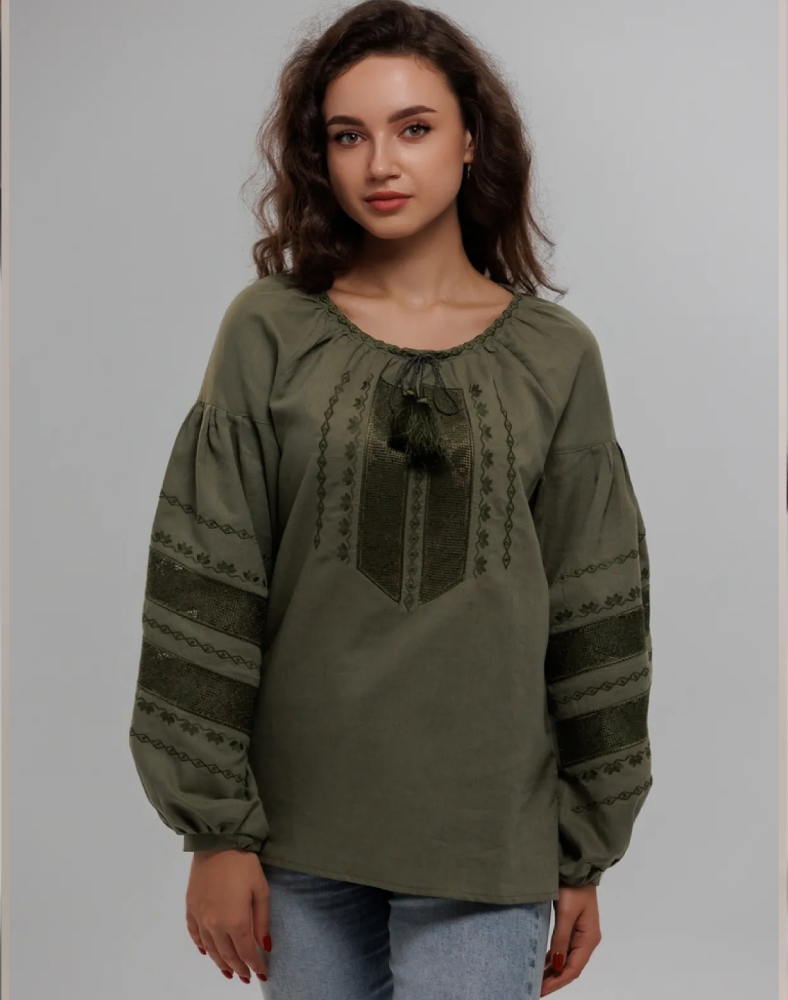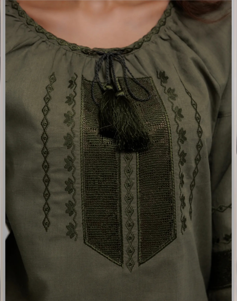 Эта блуза создана для тех, кто ценит натуральные ткани, удобный крой и выразительные детали без лишней яркости. Орнамент выполнен нитями цвета хаки на передней части изделия и рукавах. В вышивке сочетаются геометрические и растительные мотивы, которые формируют цельную и гармоничную композицию. Ажурные элементы добавляют модели лёгкости, а тональное исполнение делает её особенно элегантной.