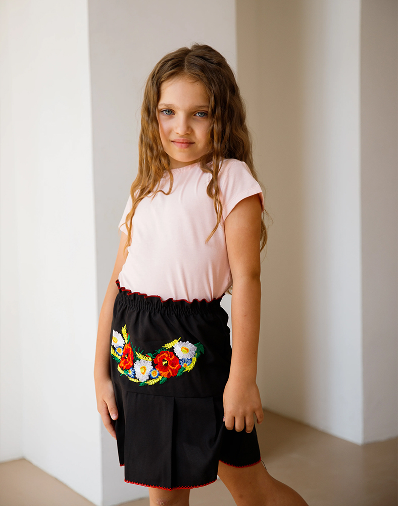 Детская вышитая юбка «Стежинка» — яркий элемент национального наряда для девочки. На чёрном габардиновом полотне расцветает красочный орнамент с маками и колосками — символами красоты, достатка и любви к родной земле.