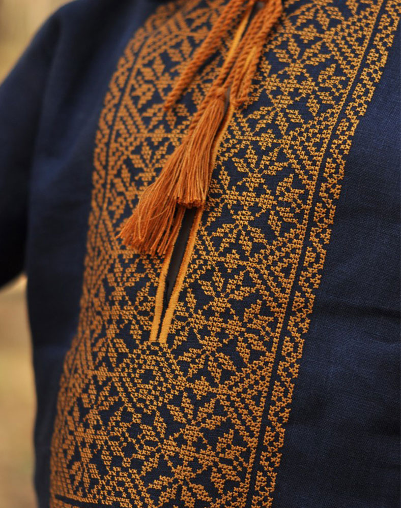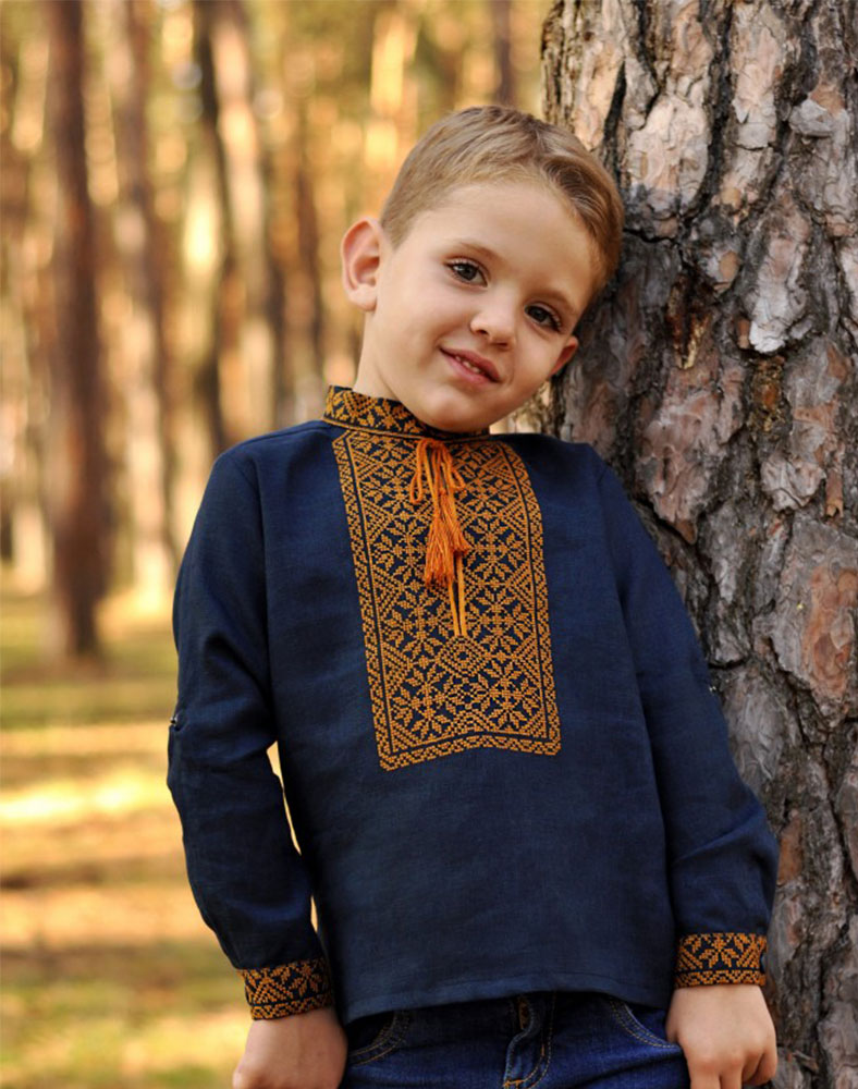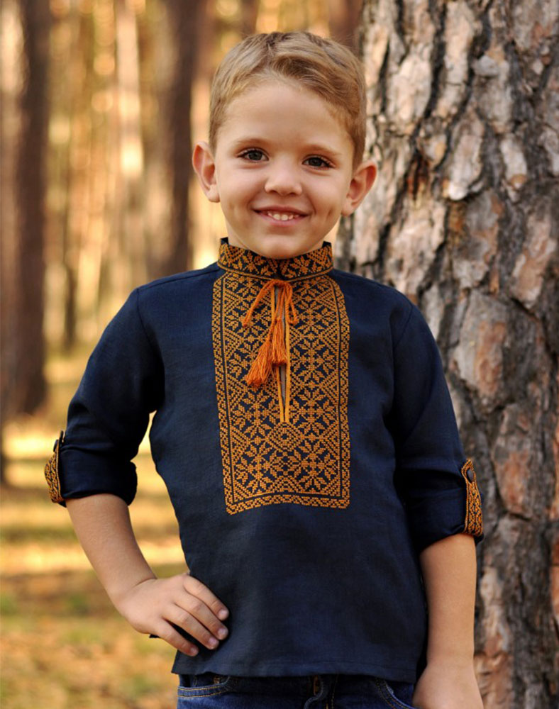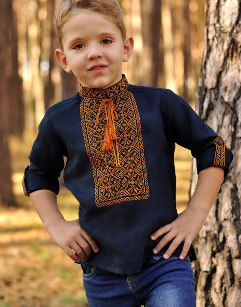 Бронзовый орнамент на тёмно-синем фоне подчёркивает украинские традиции и придаёт рубашке торжественный вид. Символика вышивки имеет значение оберега, защищая ребёнка и даря уверенность. Удобный крой с длинным рукавом, который легко подвернуть, делает модель практичной в повседневной носке.