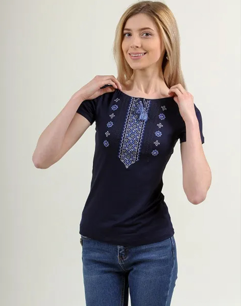 Футболка-вышиванка женская «Традиционный орнамент» — синяя с голубой вышивкой
