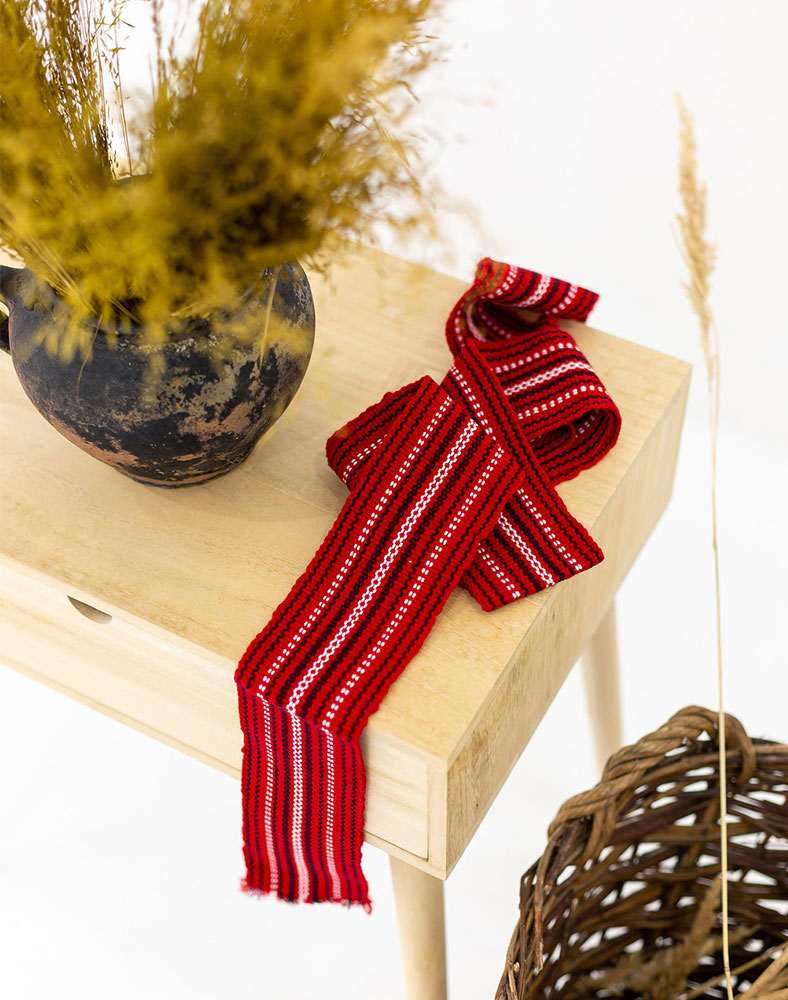 Прочная ручная работа, узор в красно-бело-чёрной гамме — символическое сочетание силы, защиты и родственного тепла. Крайку можно завязывать классически или креативно — в зависимости от стиля образа.