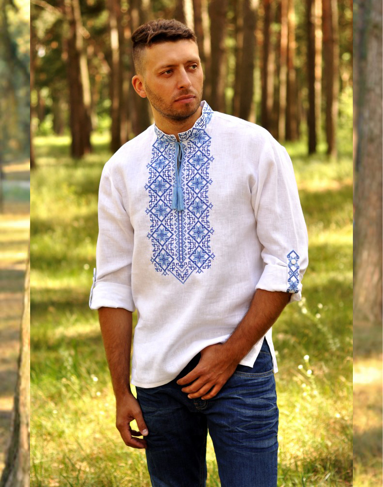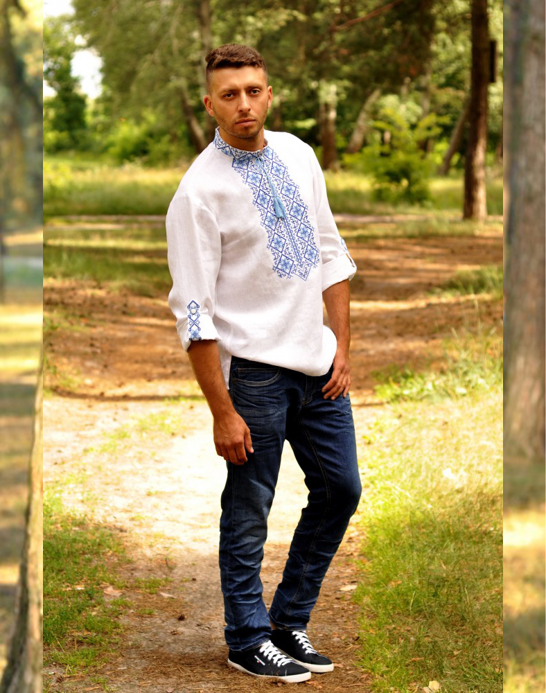 Эта рубашка-вышиванка имеет одну приятную деталь – патик, благодаря которому длинный рукав очень легко превращается в короткий. Узор выполнен в технике двойного крестика, что придает выразительность и объемность вышивке.